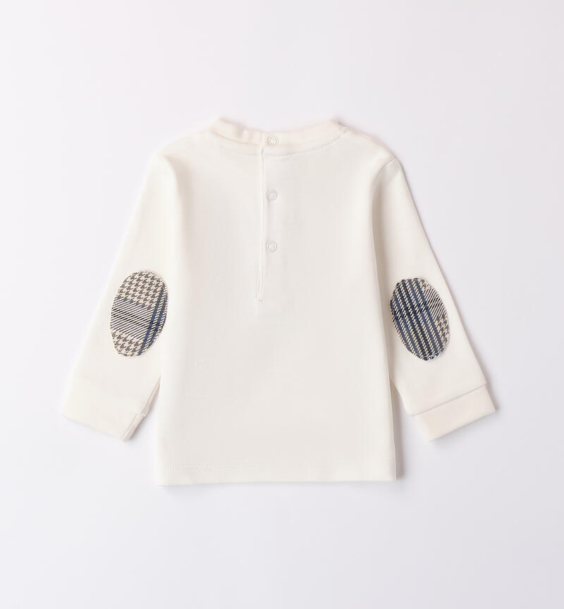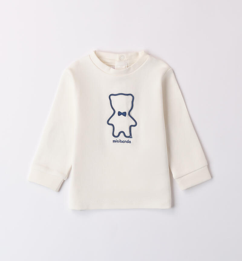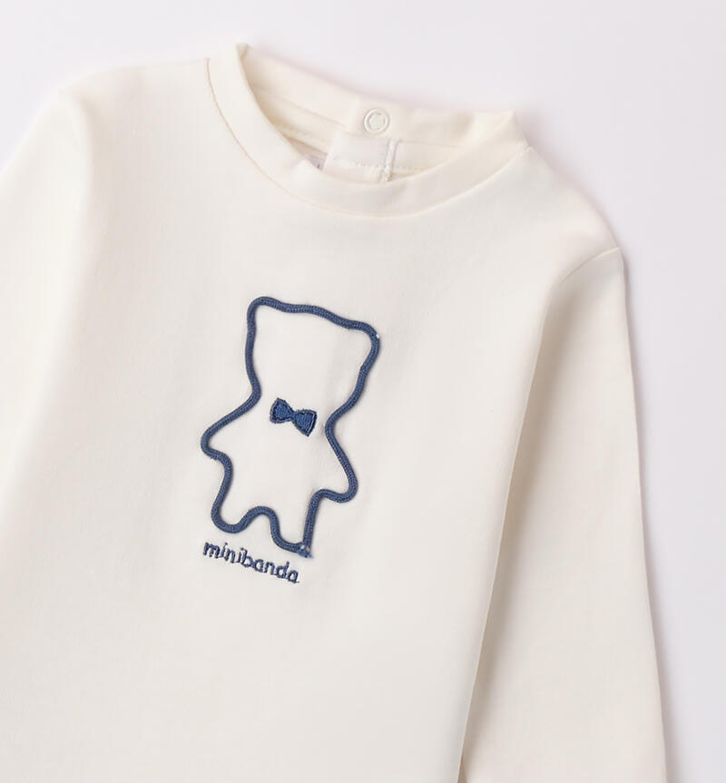 Maglia per bimbo Minibanda 1-24 mesi realizzata in interlock 100% cotone. Il modello presenta apertura sul retro con bottoni a pressione per agevolare il cambio e la vestizione. L’articolo realizzato in fantasia tinta unita รจ arricchito da ricamo con orsetto sul davanti e toppe in applicazione sui gomiti.