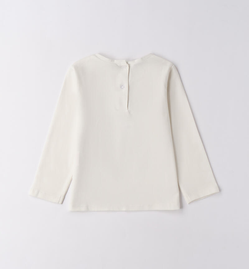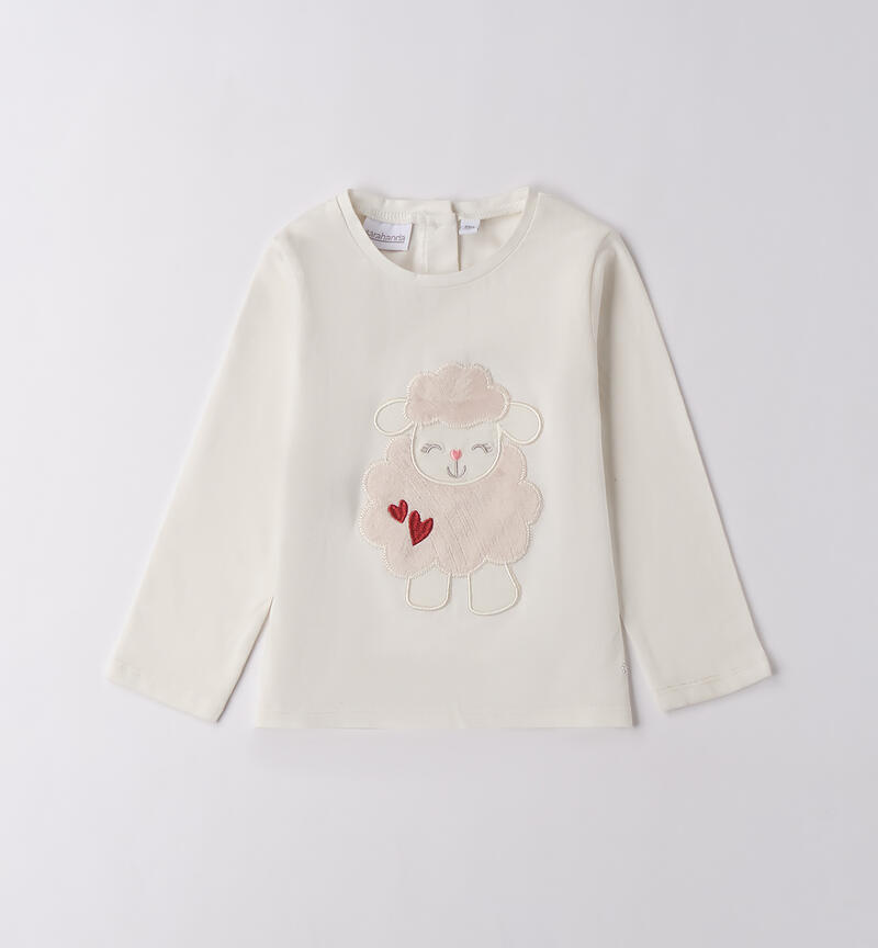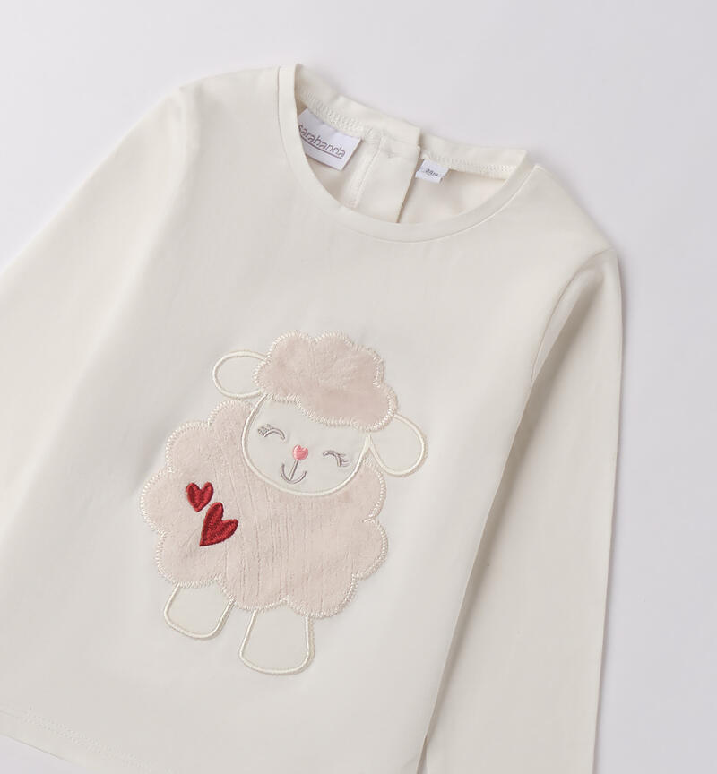 Maglietta bambina Sarabanda realizzata in jersey stretch di caldo cotone, manopesca. Il modello è arricchito da applicazione ricamo. Il prodotto non contiene materiali di derivazione animale. Animal free è un marchio di LAV www.animalfree.info