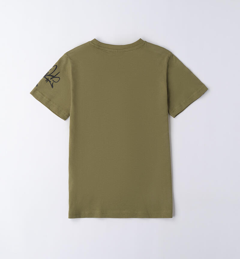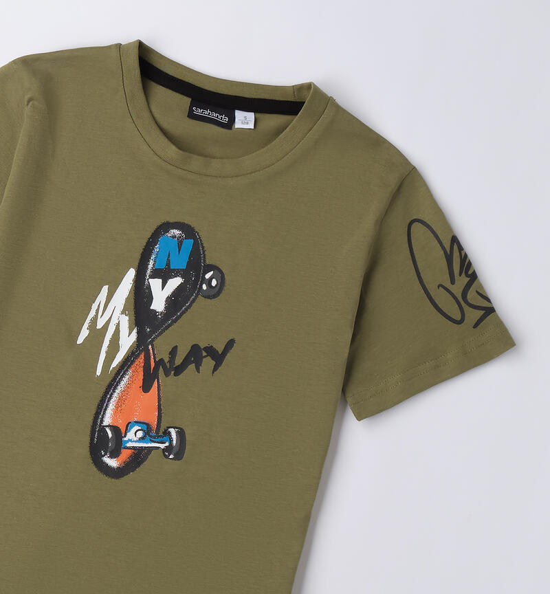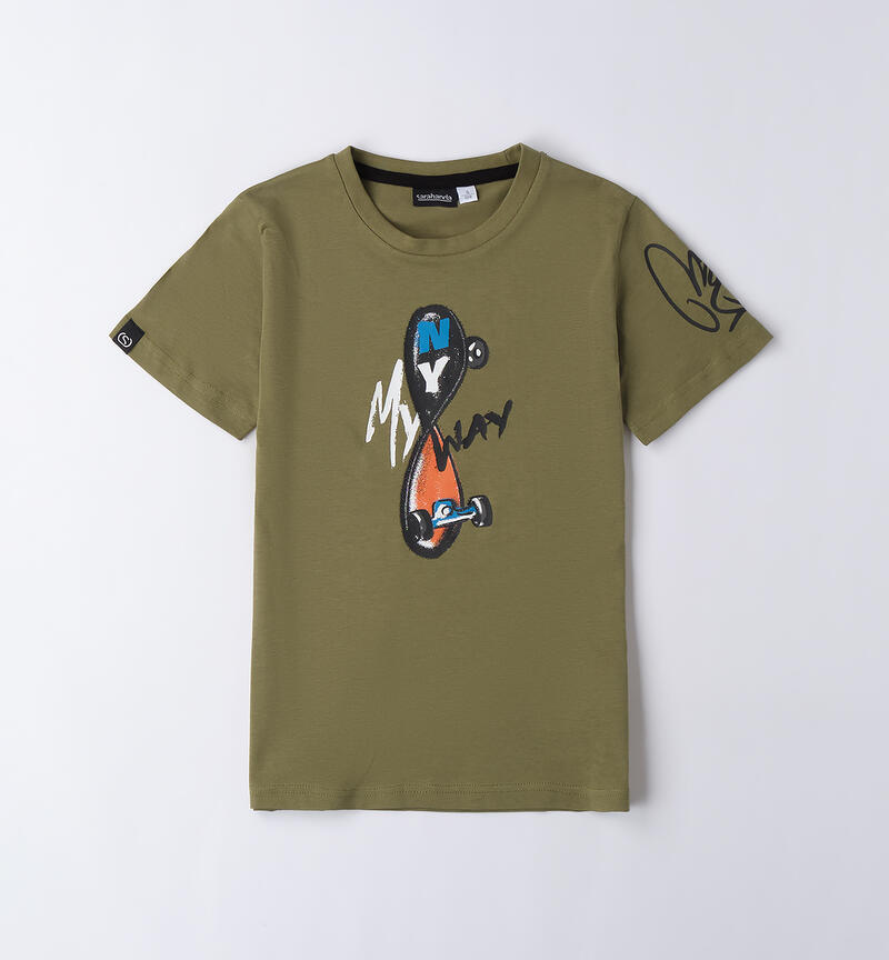 T-Shirt per ragazzo Sarabanda realizzata in jersey stretch di cotone. Il modello è in fantasia tinta unita con stampa.