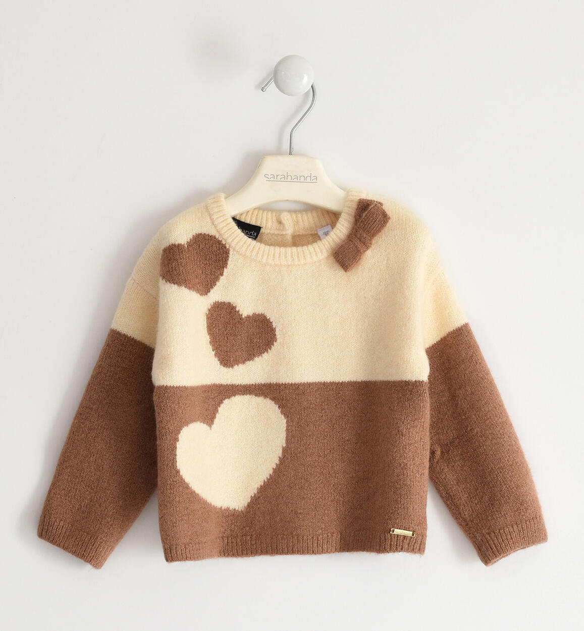 Maglia bambina Sarabanda realizzata in morbidissimo tricot stretch bicolore con ricami cuori a intarsio e fiocco in applicazione. Apertura dietro con bottoni