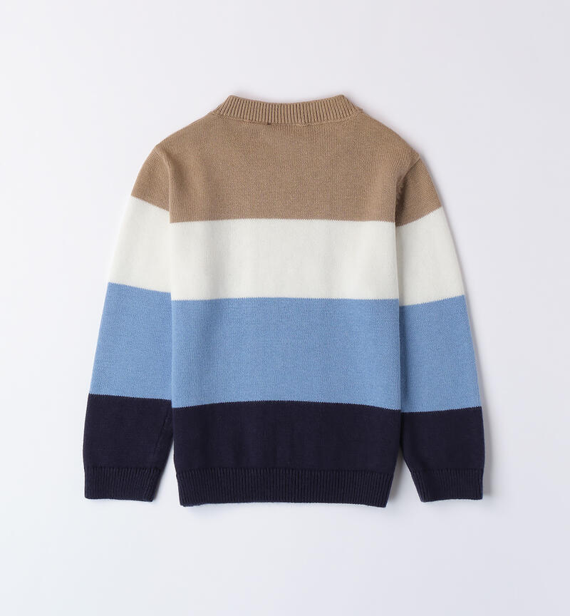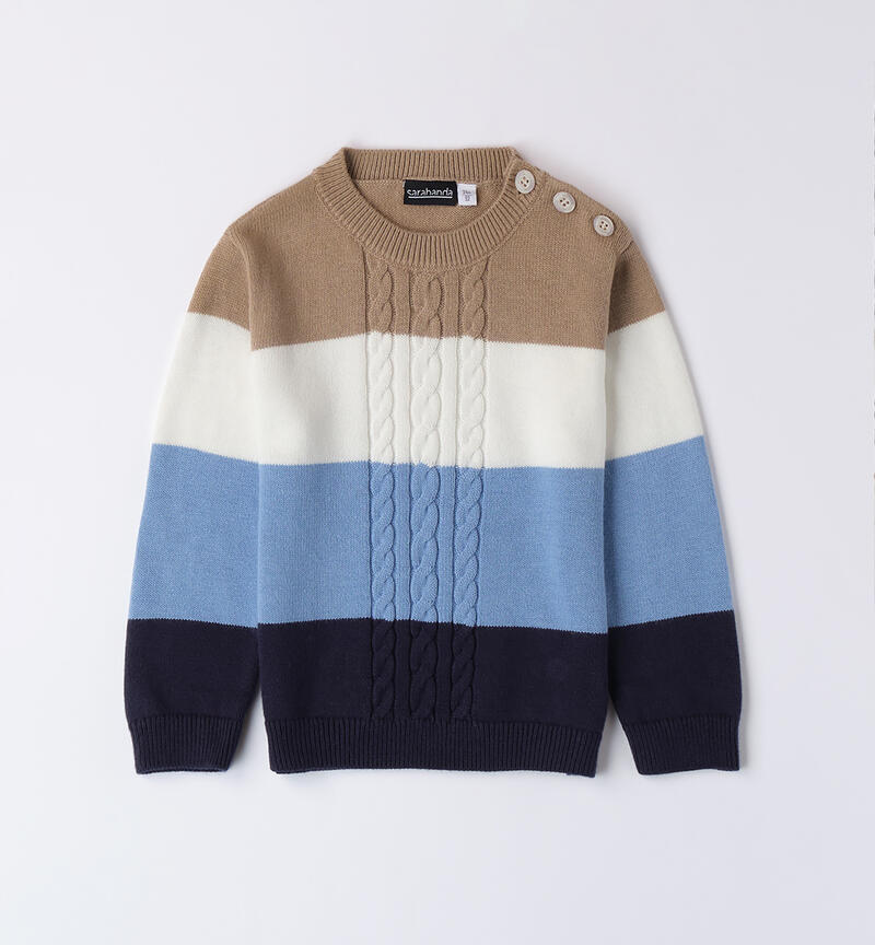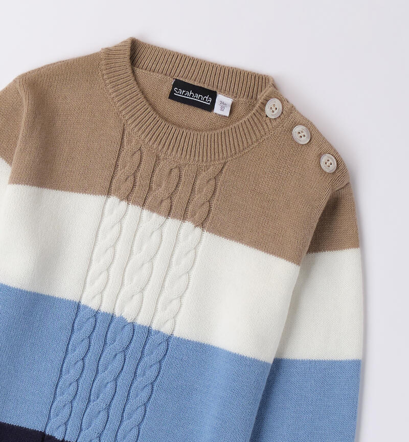 Maglione bambino Sarabanda 9 mesi – 8 anni realizzato in tricot. Il modello presenta apertura sulla spalla con bottoni a pressione, fantasia multicolor a blocchi di colore.