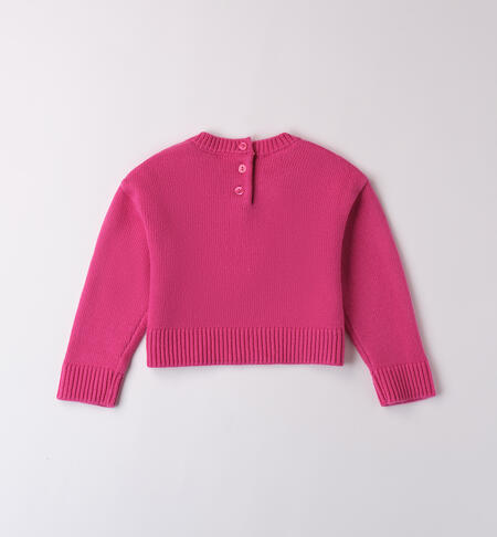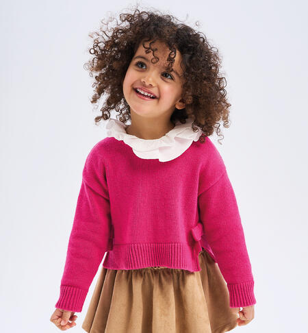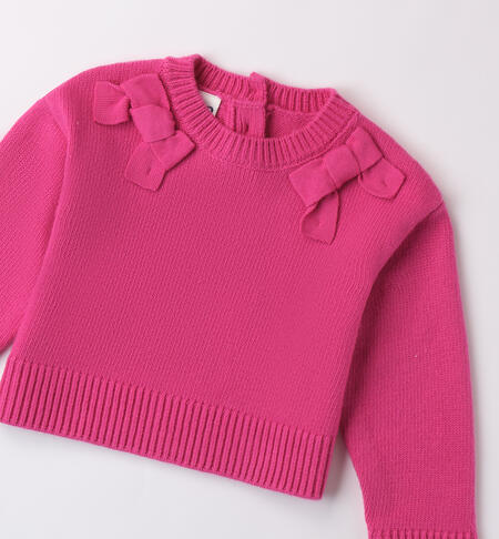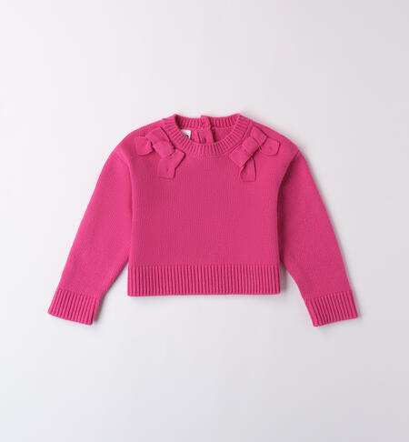 Maglione per bambina iDO 9 mesi – 8anni realizzato in tricot. Il modello presenta apertura sul retro con bottoni ed รจ arricchito davanti da fiocchi in applicazione.