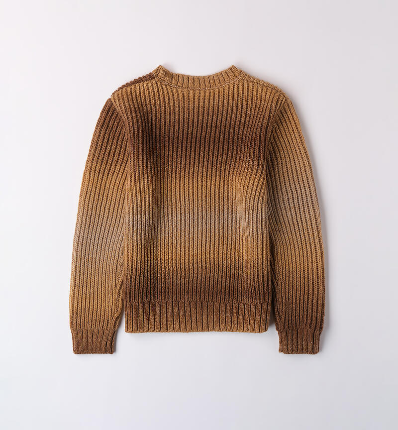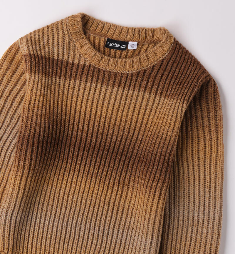 Maglione bambino Sarabanda realizzato in tricot. Il modello presenta apertura sulla spalla con bottoni a pressione, fantasia con effetto sfumato.