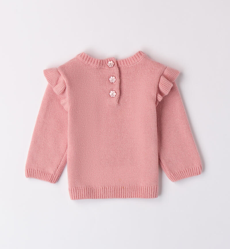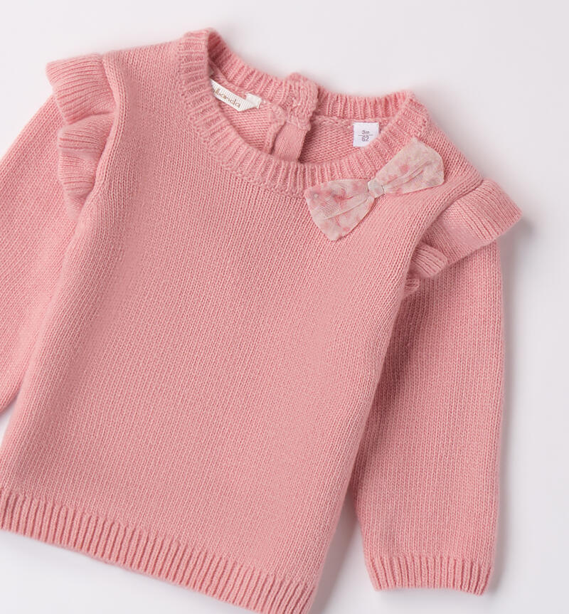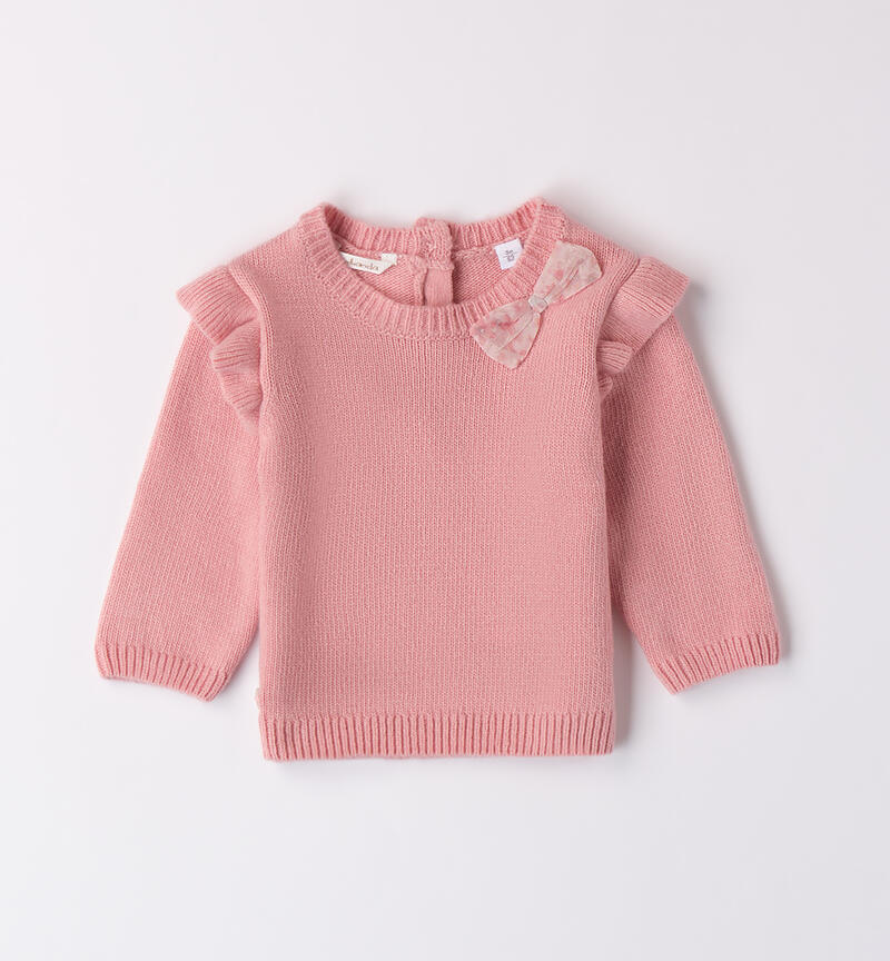 Maglioncino per bimba Minibanda 1-24 mesi realizzato in tricot. Il modello presenta apertura sulla schiena con bottoni e davanti è arricchito da fiocco in tulle floreale. Ruches sulle maniche
