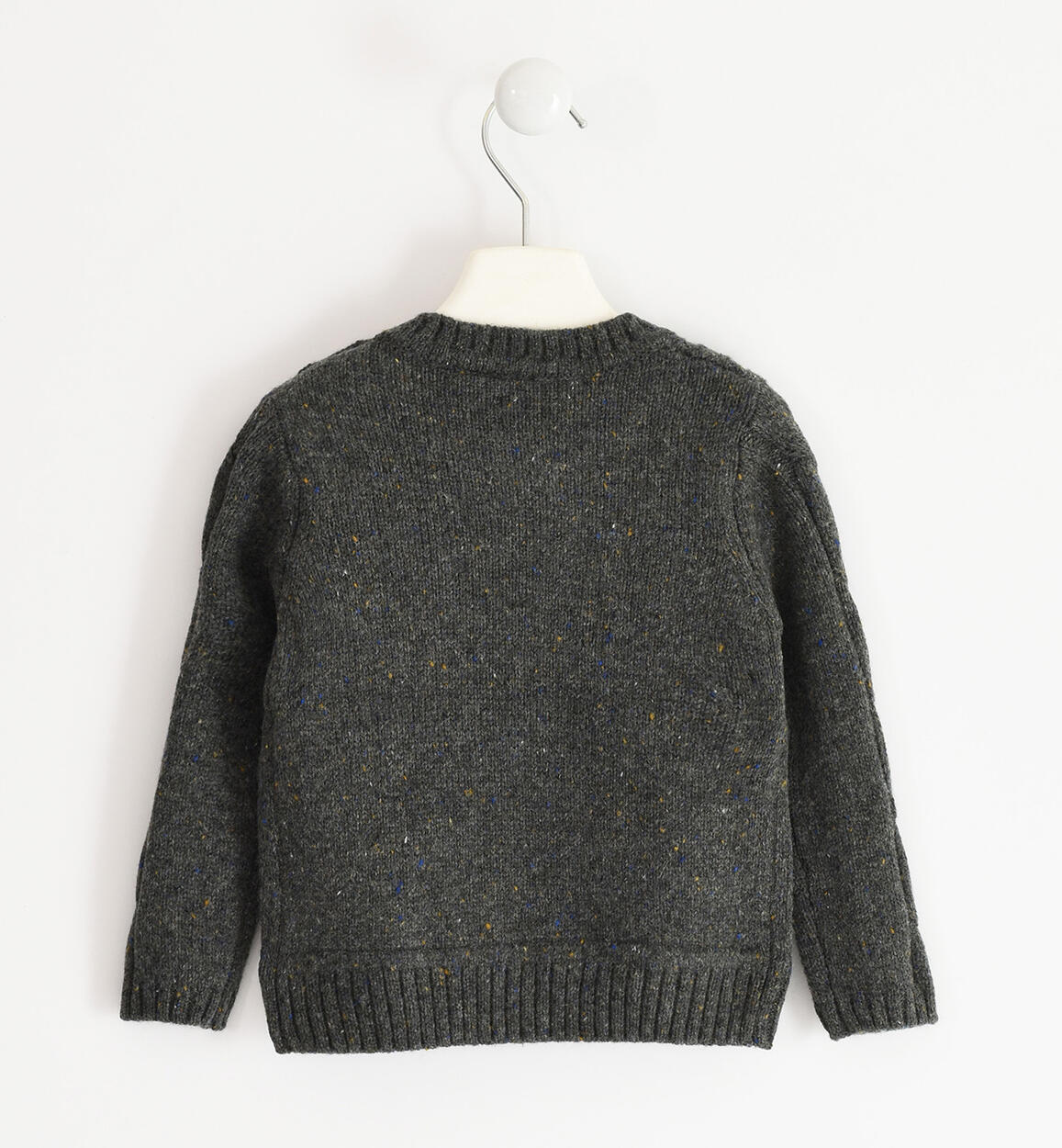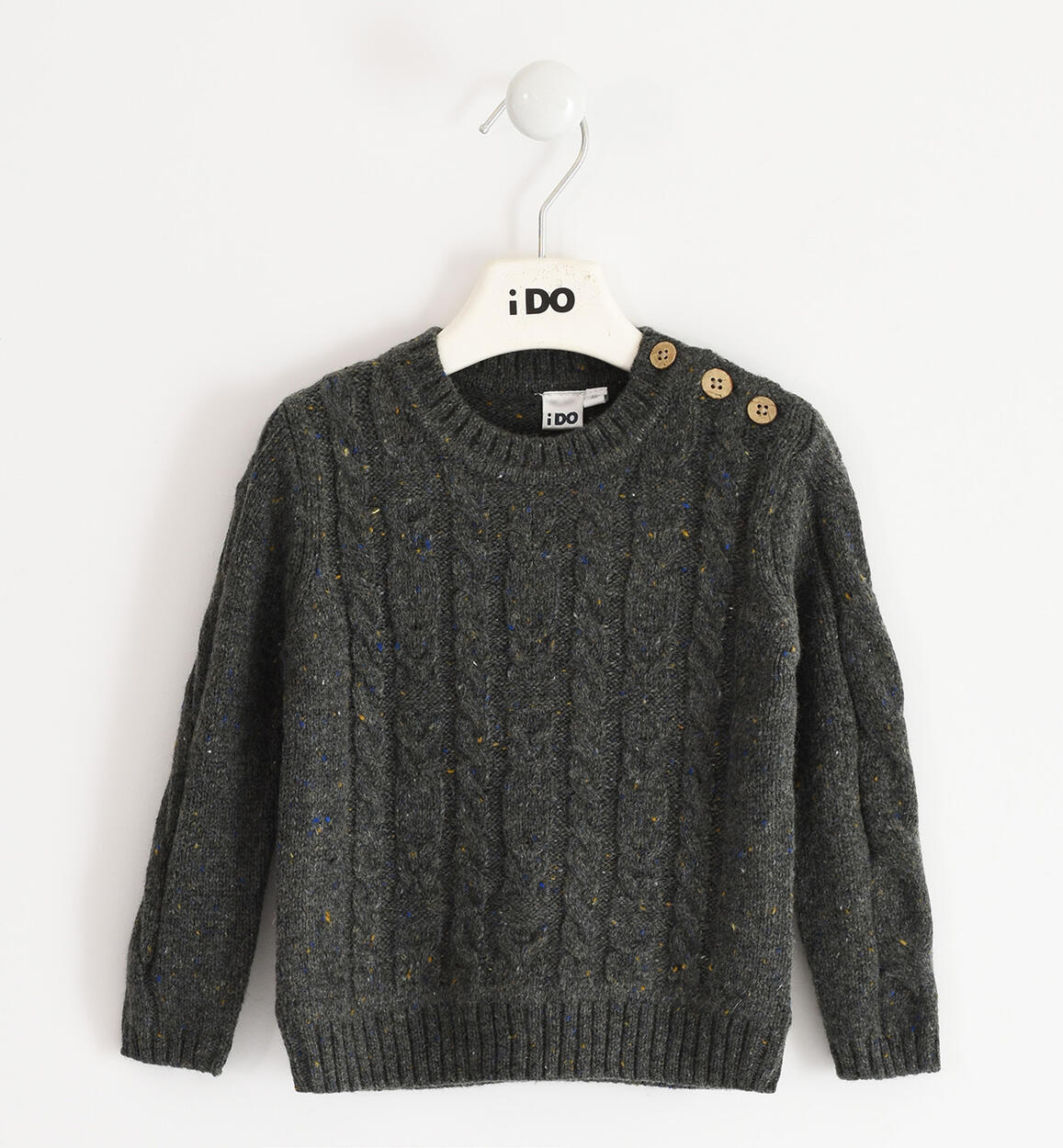 Maglione bambino realizzato in tricot mélange con lavorazione a treccia. Apertura sulla spalla con bottoni fino alla taglia 3 anni.