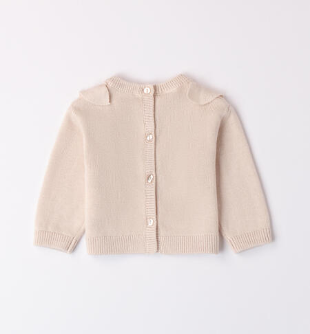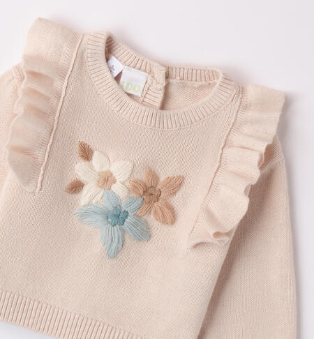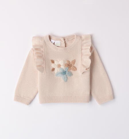 Maglioncino per neonata iDO 1-24 mesi realizzato in tricot di cotone e lana. Il modello presenta apertura sul retro con bottoni, ruches e ricamo fiori in arricchimento.