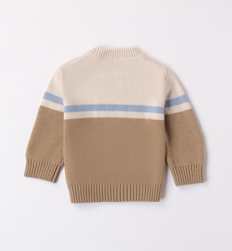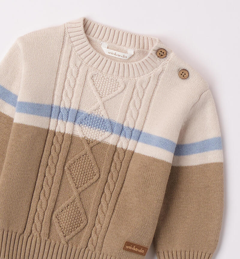 Maglioncino per bimbo Minibanda 1-24 mesi realizzato in cotone e lana. Il modello presenta apertura sulla spalla con bottoni e fantasia in blocchi di colore. Ricamo treccia davanti.