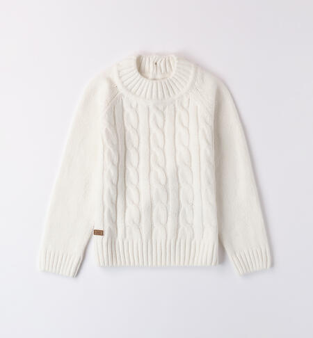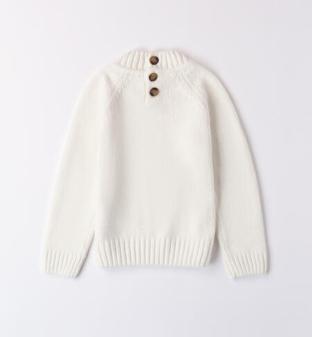 Maglione per bambino iDO realizzato in tricot. Il modello presenta apertura sul retro con bottoni fino alla taglia 3 anni e fantasia tinta unita. Lavorazione a treccia.