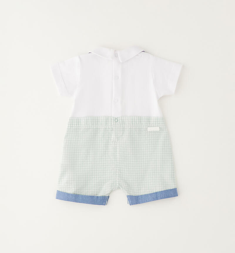 Pagliaccetto per neonato Minibanda realizzato in 100% cotone. Modello finta salopette con maglietta in jersey arricchita da ricamo e pantaloncino in tessuto increspato. Apertura dietro e nell’interno gamba con bottoni a pressione.