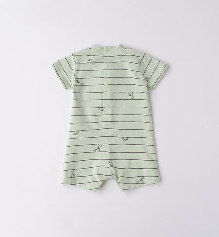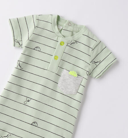 Pagliaccetto per neonato iDO 0-18 mesi in jersey elasticizzato di cotone. L’articolo ha apertura sul retro e nel sottogamba con bottoni a pressione per facilitare la vestizione ed รจ in fantasia a righe. Taschino davanti. Tema dinosauri.