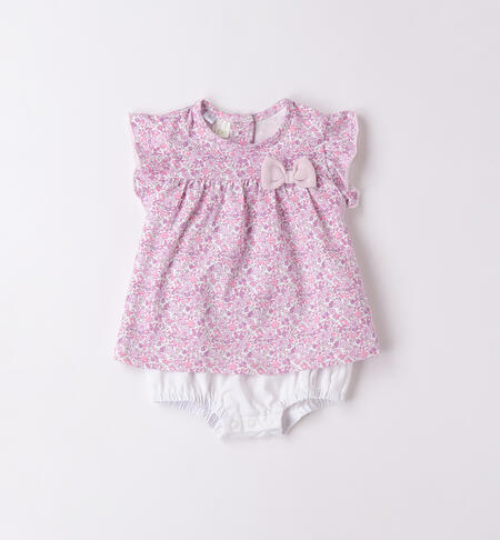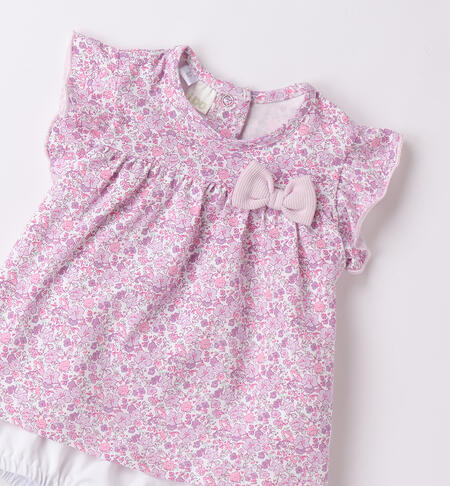 Pagliaccetto neonata estivo iDO 0-18 mesi realizzato in jersey stretch di cotone. Il modello presenta apertura sul retro e nel sottogamba con bottoni a pressione per agevolare il cambio e la vestizione. Il pagliaccetto รจ in fantasia allover nella parte superiore e in tinta unita nella parte inferiore. Fiocco in applicazione.