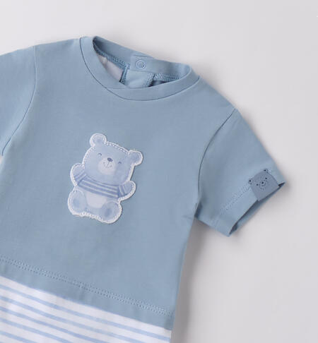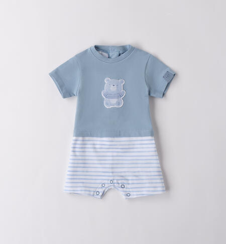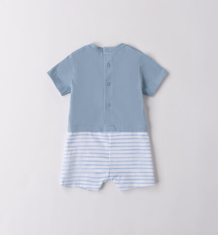 Pagliaccetto per neonato iDO in jersey elasticizzato di cotone. Il modello presenta apertura sul retro e nel sottogamba con bottoni a pressione per agevolare il cambio e la vestizione. Il pagliaccetto รจ in fantasia tinta unita nella parte superiore e in fantasia a righe nella parte inferiore.