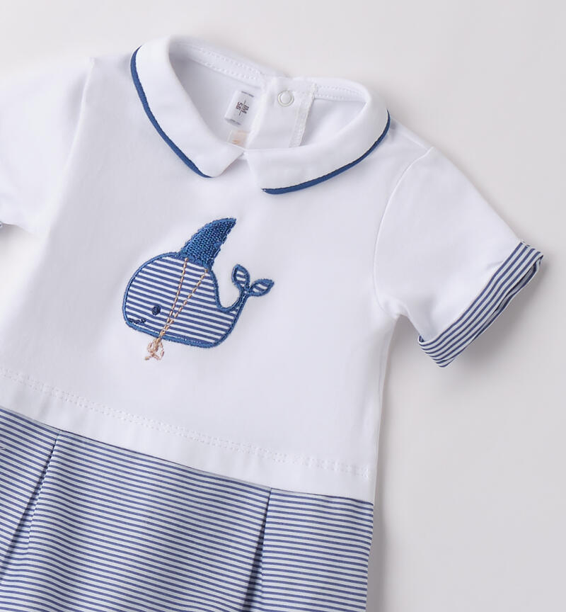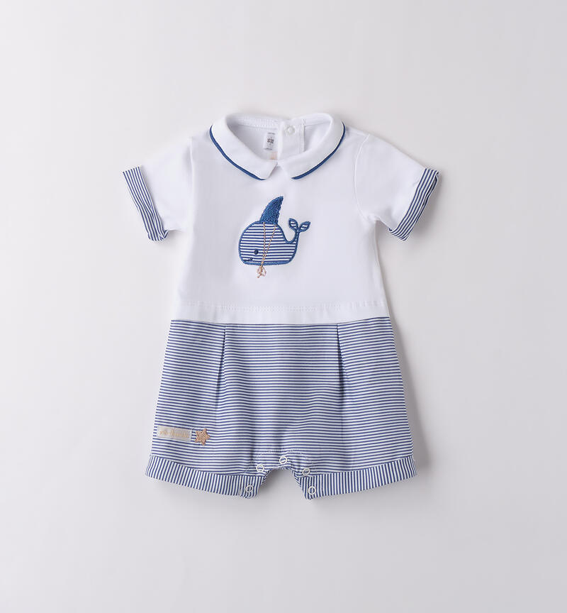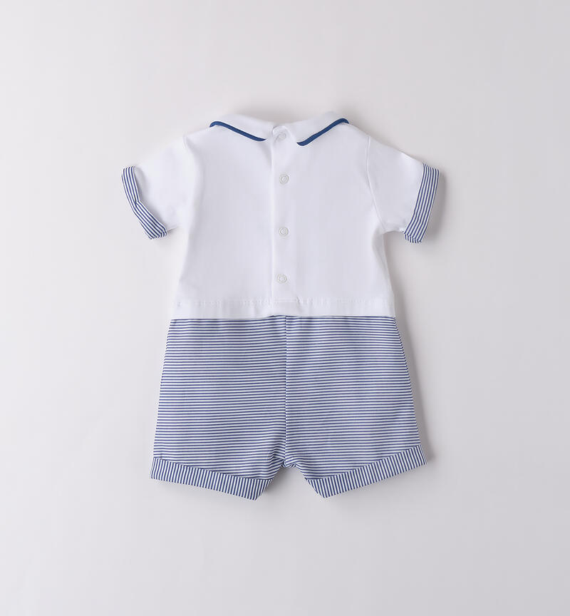 Pagliaccetto per neonato Minibanda 0-18 mesi realizzato in jersey stretch di cotone. Il modello presenta apertura sul retro e nel sottogamba con bottoni a pressione per agevolare il cambio e la vestizione. Il pagliaccetto รจ in fantasia tinta unita nella parte superiore e a righe nella parte inferiore e sulle maniche.