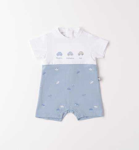 Grazioso pagliaccetto iDO per neonato da 0 a 18 mesi realizzato in jersey stretch di cotone. Ricamo davanti e stampa all over di macchinine. Il modello presenta apertura sul retro e nel sottogamba con bottoni a pressione per agevolare il cambio e la vestizione.