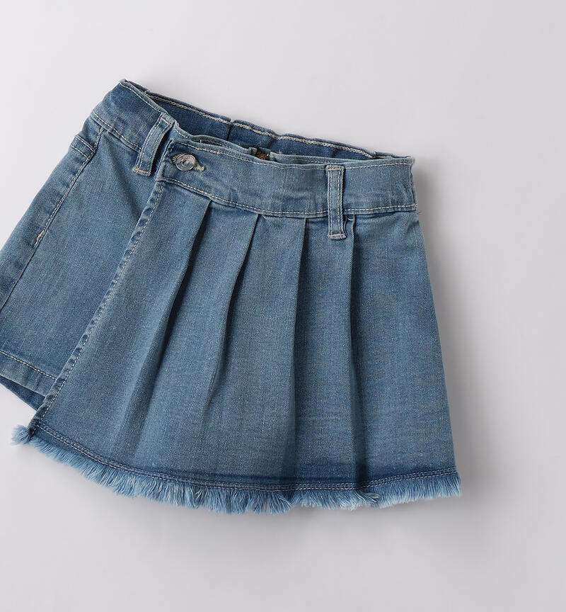Shorts Sarabanda da 9 mesi a 8 anni realizzato in denim stretch di cotone con inserto davanti per effetto gonna. Fondo sfrangiato. Vita regolabile con elastico asolato interno.