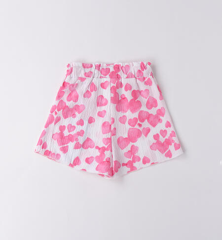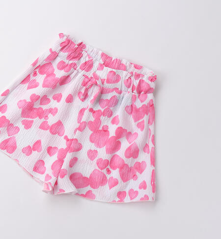 Pantaloni corti per bambina iDO da 9 mesi a 8 anni in tessuto morbido e fresco. Il modello presenta vita elasticizzata con coulisse e fantasia allover di cuori