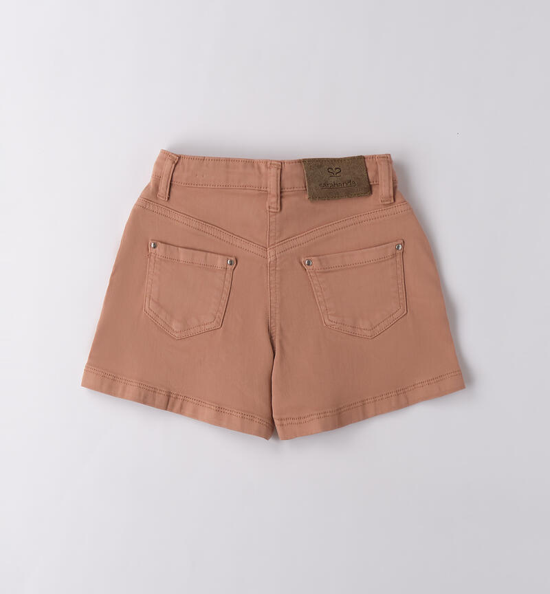 Pantaloncini per bambina Sarabanda da 9 mesi a 8 anni in twill stretch di cotone. Il modello presenta apertura con zip e bottone, tasche laterali e fantasia tinta unita.