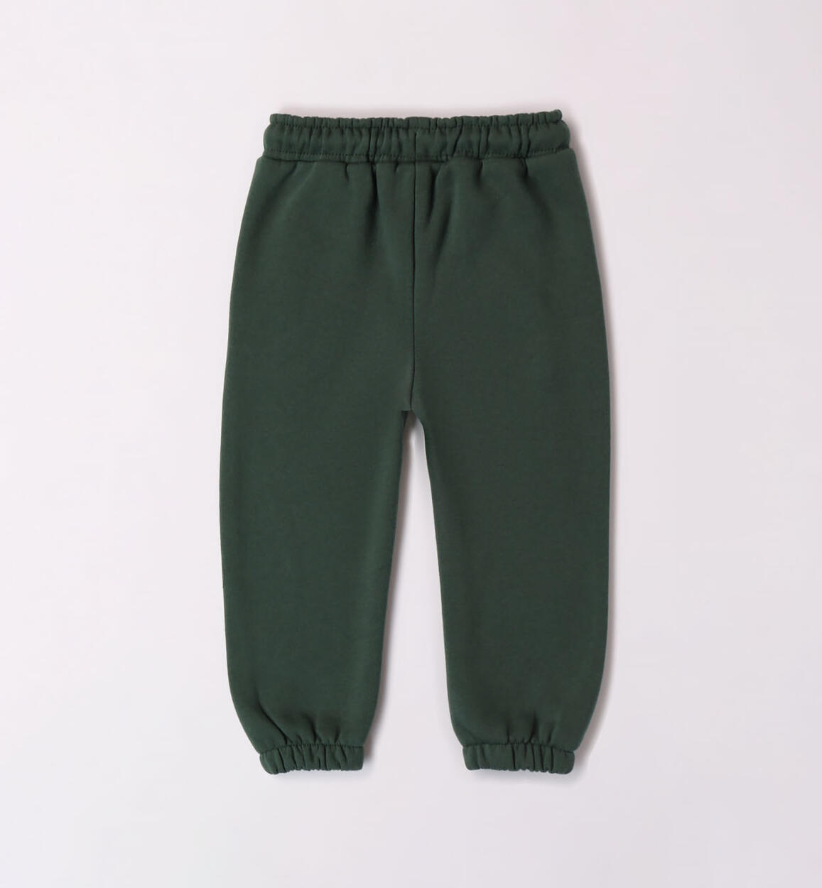 Pantalone per bambino realizzato in felpa con piccola stampa frontale e coulisse in vita, fondo gamba elasticizzato.