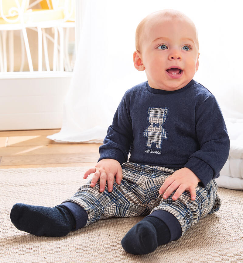 Pantalone per bimbo Minibanda 1-24 mesi in tessuto felpato internamente, pesantezza invernale. Il modello presenta vita elasticizzata con coulisse, polsini sul fondo e tasche laterali.