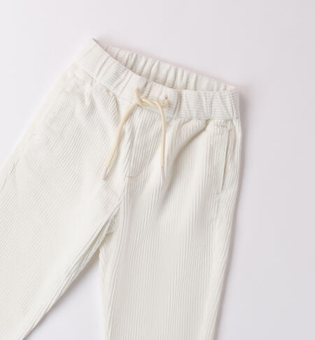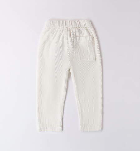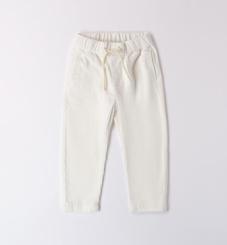 Pantaloni bambino iDO realizzati in velluto a coste in cotone stretch. Il modello ha vita elasticizzata con coulisse tono su tono. Carrot fit, vita regolabile con elastico asolato interno.