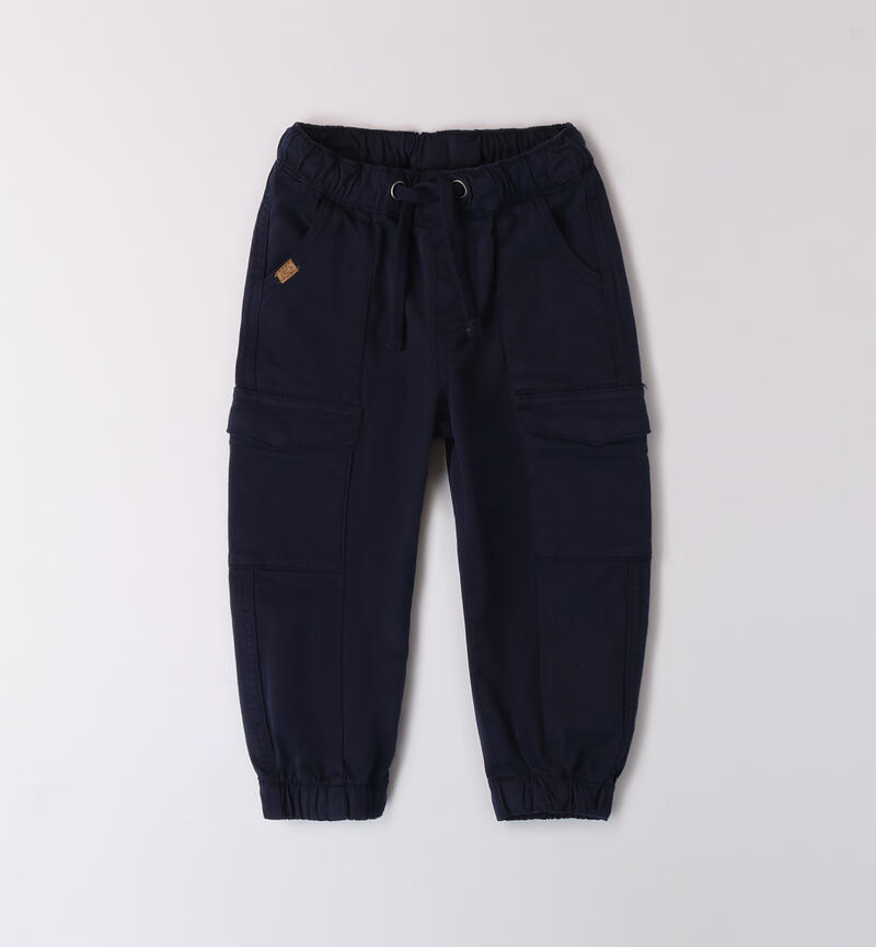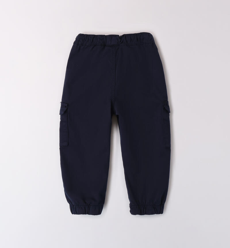 Pantalone da bambino Sarabanda realizzato in twill. Il modello ha vita elasticizzata con coulisse, tasche laterali, polsini sul fondo e fantasia tinta unita. Vestibilitร loose fit.