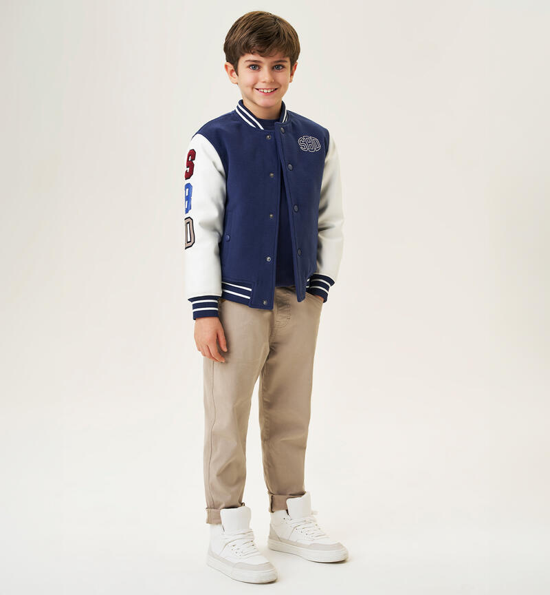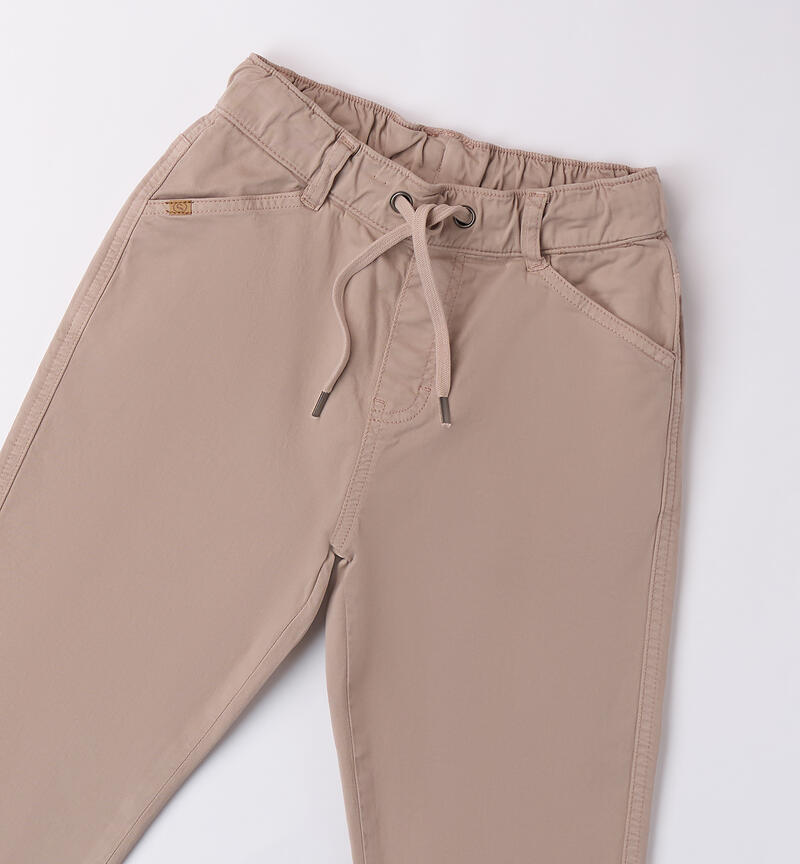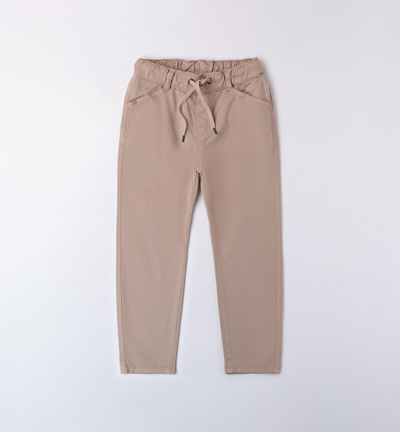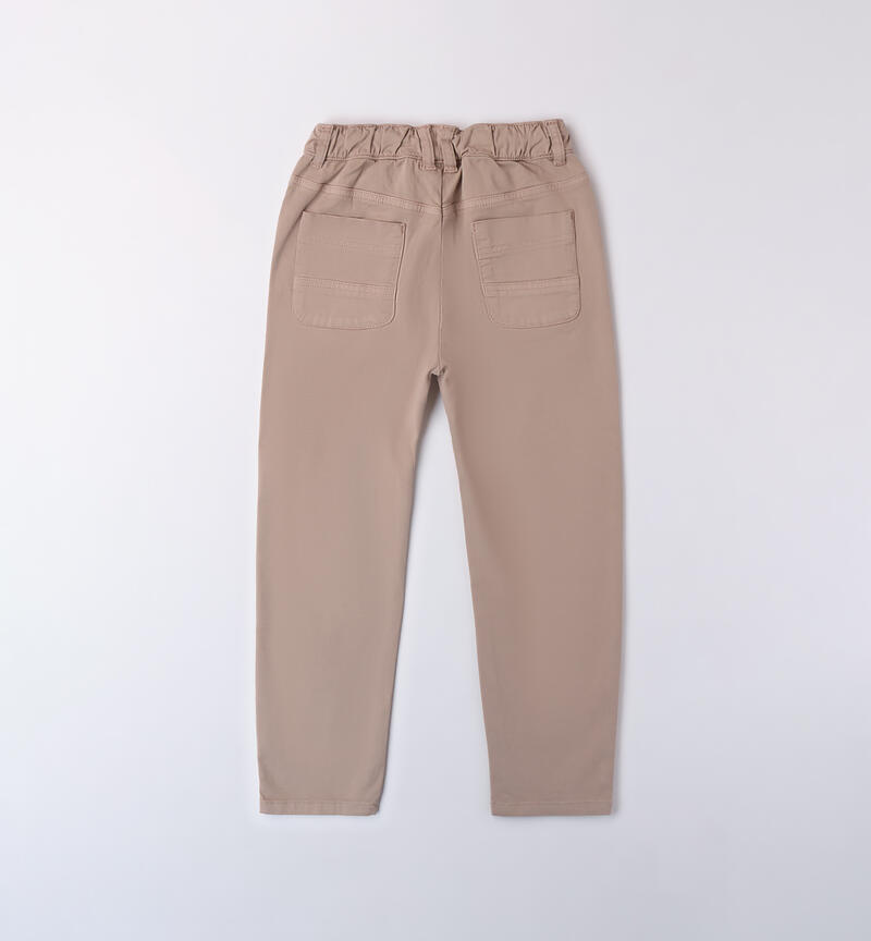 Pantalone per ragazzo Sarabanda realizzato in tessuto twill. Il modello ha vita elasticizzata con coulisse, tasche laterali ed è in fantasia tinta unita. Vestibilità carrot fit.