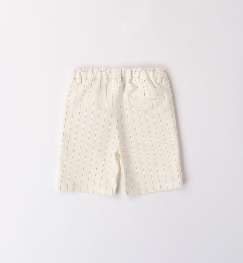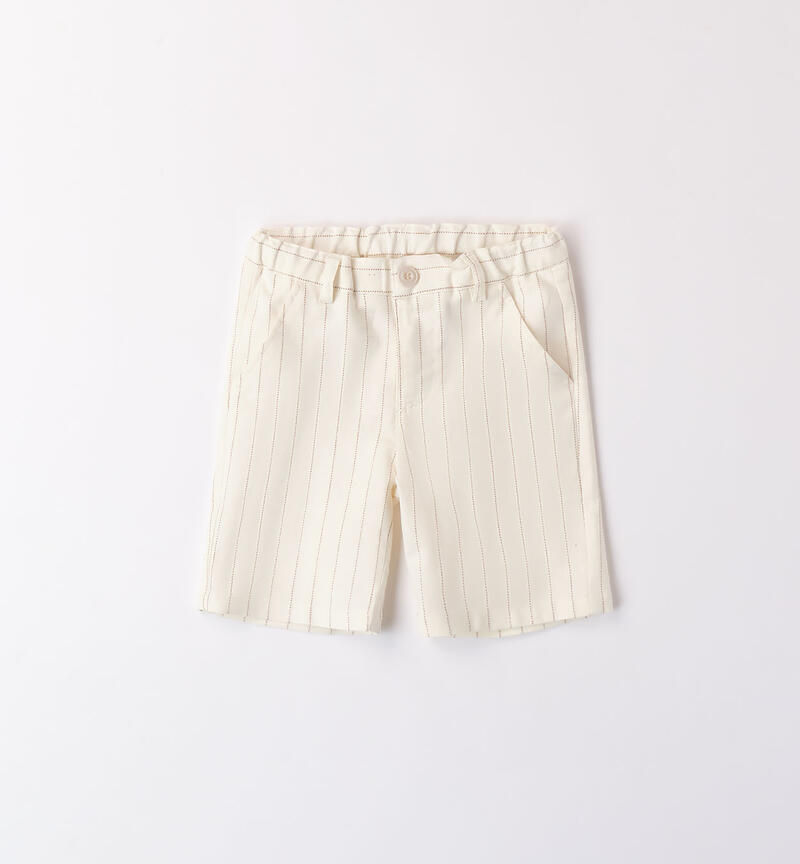 Pantaloni corti bambino Sarabanda realizzati in lino e viscosa stretch. Il modello presenta apertura con zip e bottone, tasche chino e lunghezza al ginocchio. Vestibilitร regular. Il pantaloncino รจ realizzato in fantasia a righe. Misura vita regolabile con elastico asolato interno. L’articolo fa parte della collezione Cerimonia Fashion Sarabanda