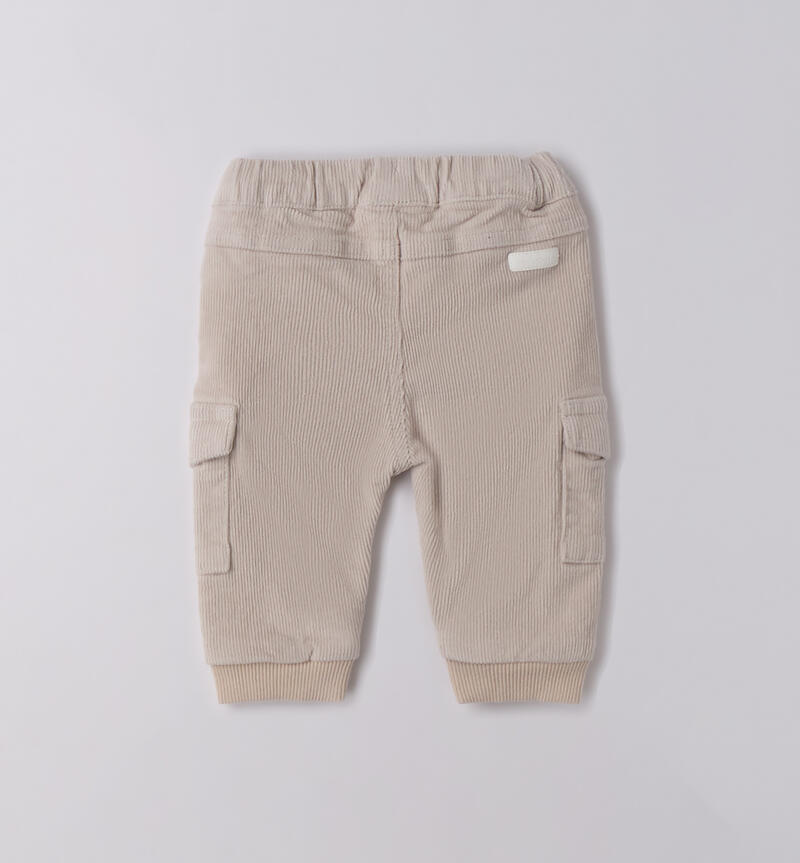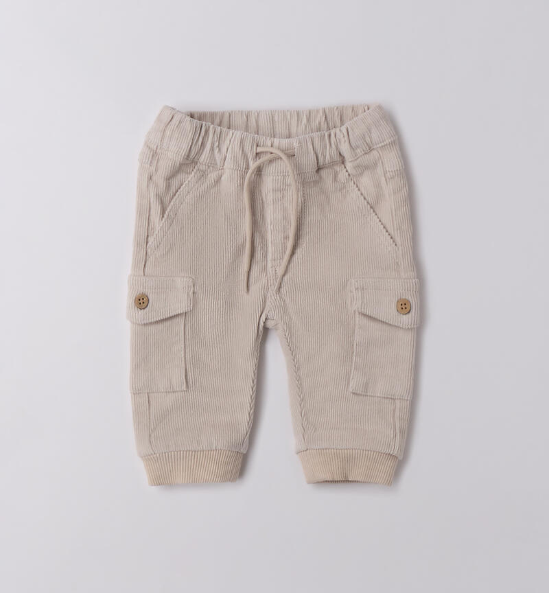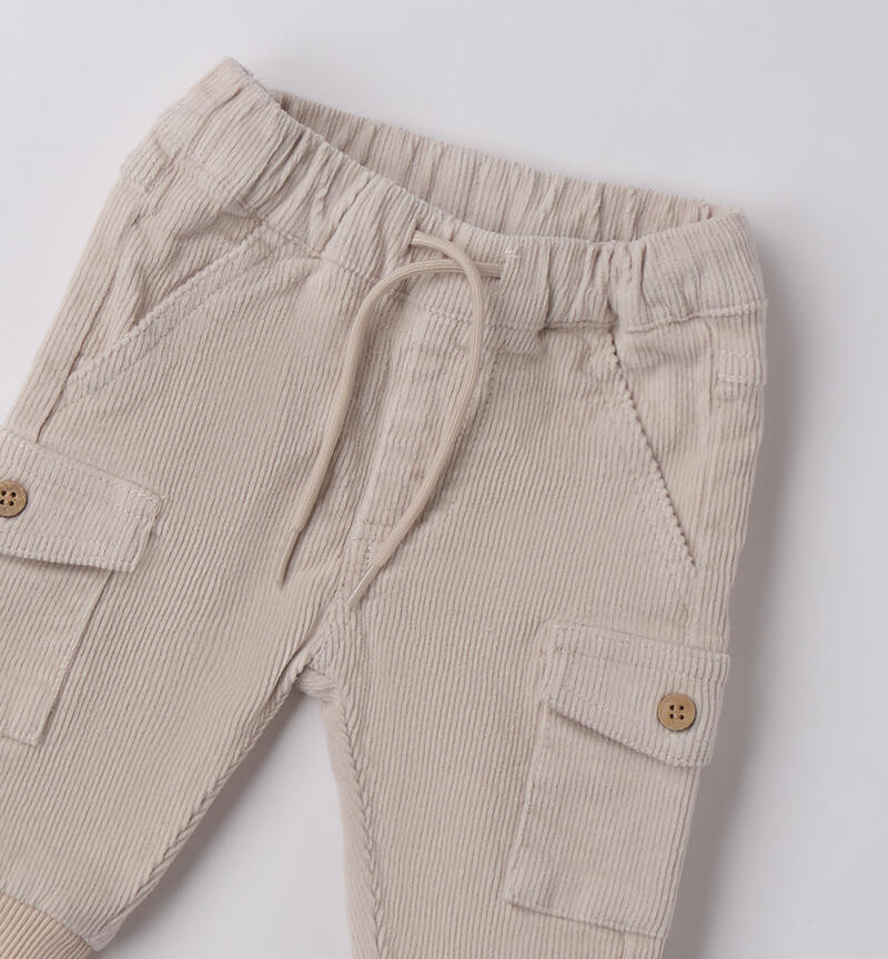 Pantalone per bimbo Minibanda 1-24 mesi in velluto di cotone stretch. Il modello presenta vita elasticizzata con coulisse e polsini sul fondo. Modello cargo con tasconi laterali.