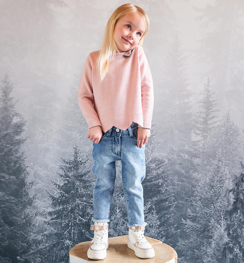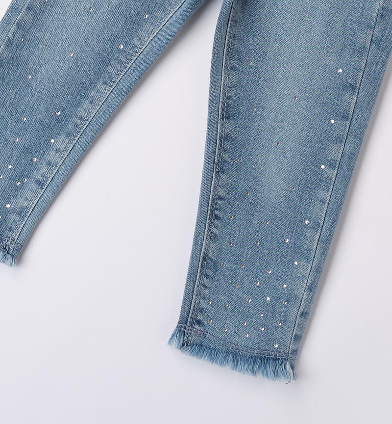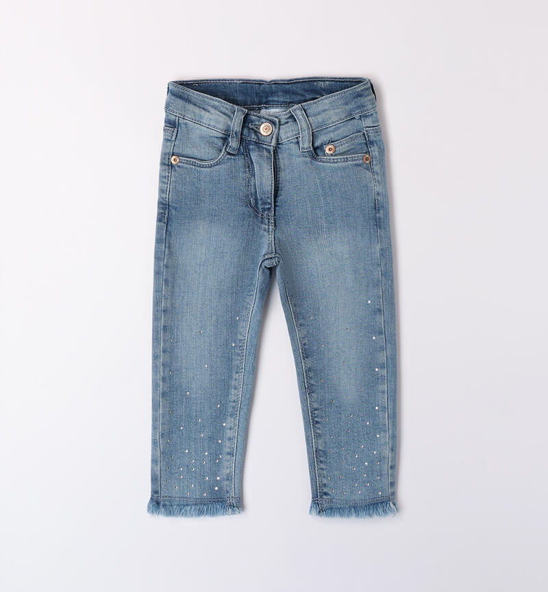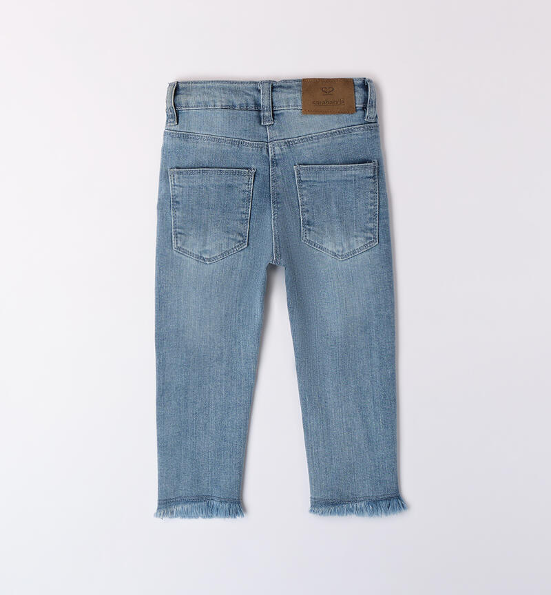 Jeans per bambina Sarabanda 9 mesi – 8 anni in denim stretch di cotone. Il modello ha apertura con bottone e zip, tasche e fondo sfrangiato. Modello super slim fit. Il jeans ha vita regolabile con elastico asolato interno ed รจ arricchito da strass.