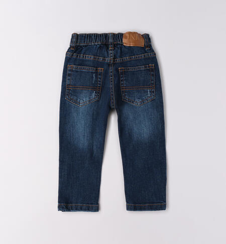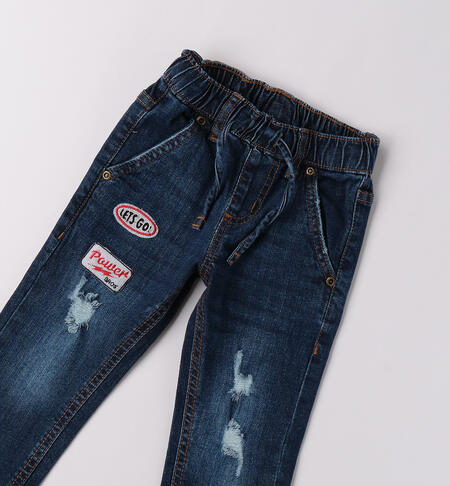 Jeans per bambino iDO 9 mesi – 8 anni realizzato in denim stretch di cotone. Regular fit. Modello arricchito da applicazioni e rotture. Vita regolabile con elastico asolato interno. Coulisse in vita.