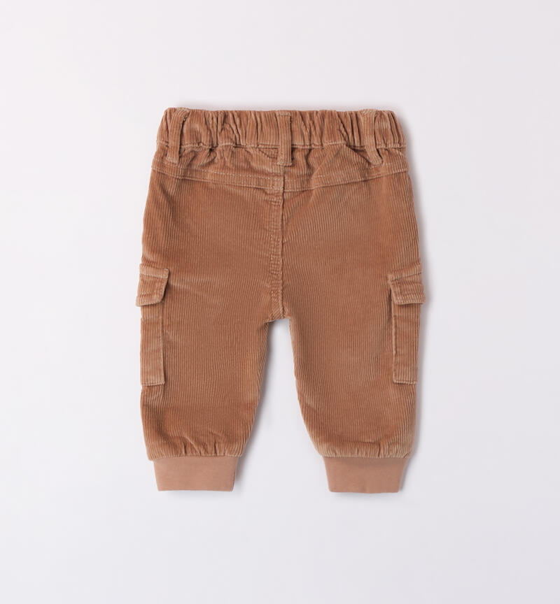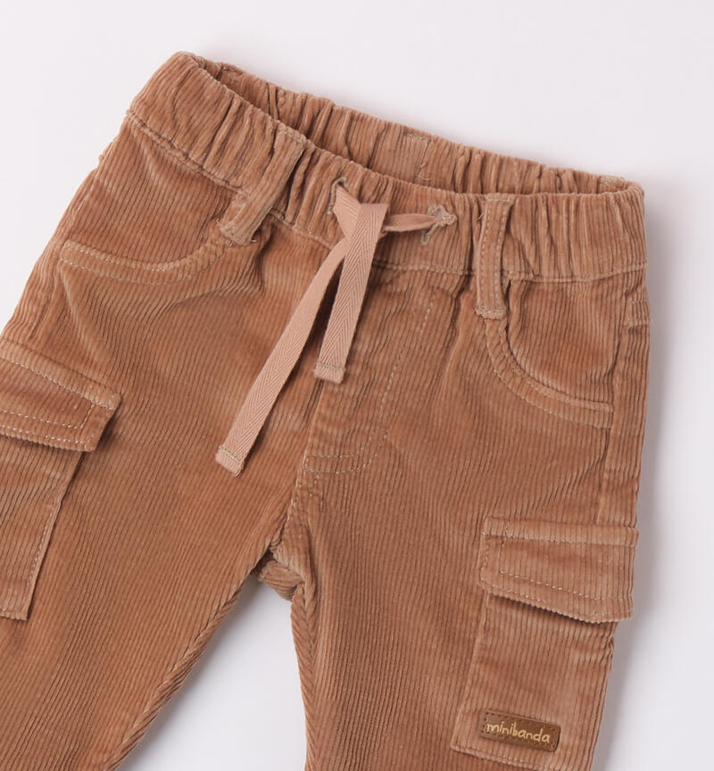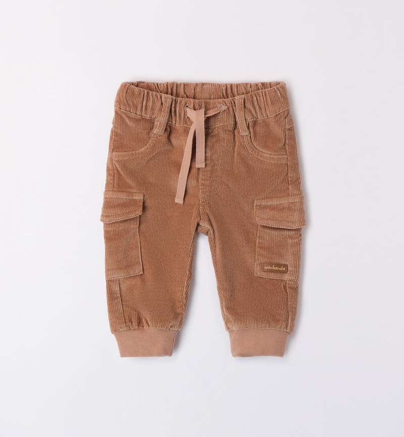 Pantalone per bimbo neonato Minibanda 1-24 mesi realizzato in velluto a coste. Il modello presenta vita regolabile con coulisse e polsini sul fondo. Modello multitasche.