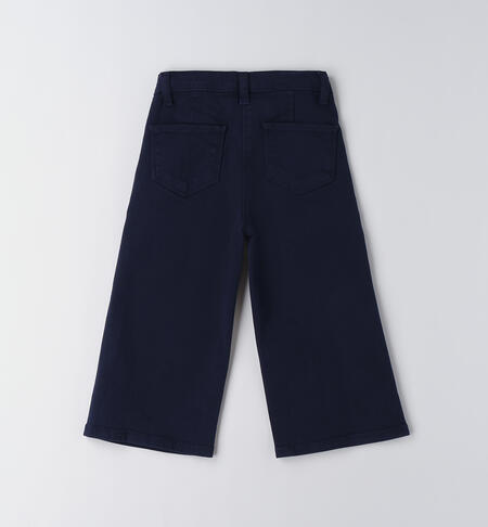 Pantaloni da bambina iDO da 9 mesi a 8 anni realizzati in tessuto twill stretch di cotone. Il modello presenta apertura con bottone e zip, tasche laterali e fantasia tinta unita. Modello con gamba ampia. Vita regolabile con elastico asolato interno