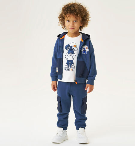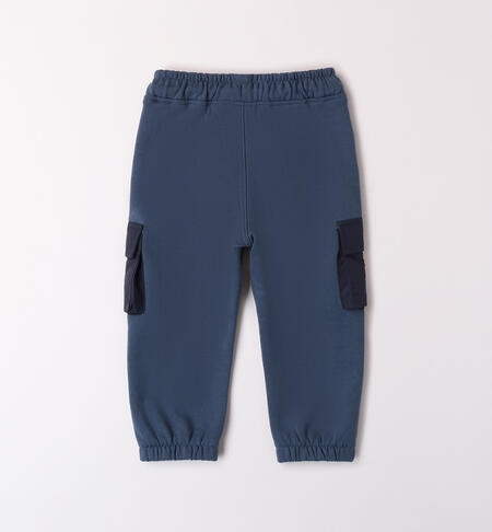 Pantaloni tuta bambino iDO realizzati in felpa pesante con tasconi laterali in nylon taslan. Il modello ha vita elasticizzata con coulisse a contrasto e polsini sul fondo.