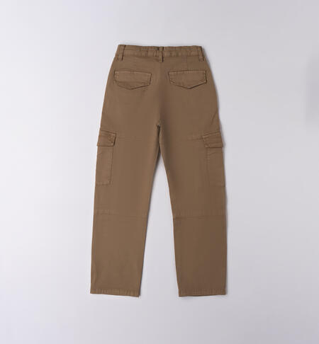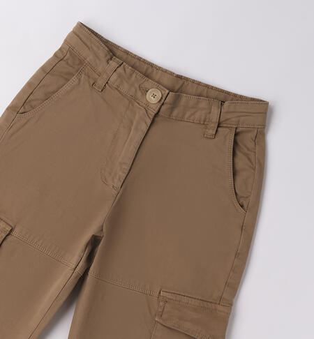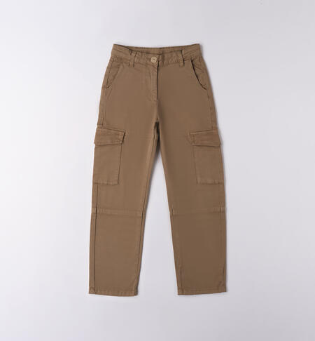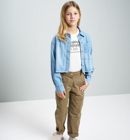 Pantaloni per ragazza iDO realizzati in twill stretch di cotone manopesca. Apertura con zip e bottone. Tasche laterali. Vita regolabile con elastico asolato interno