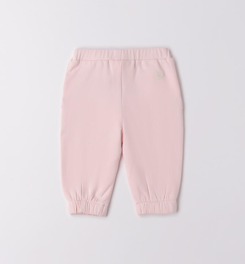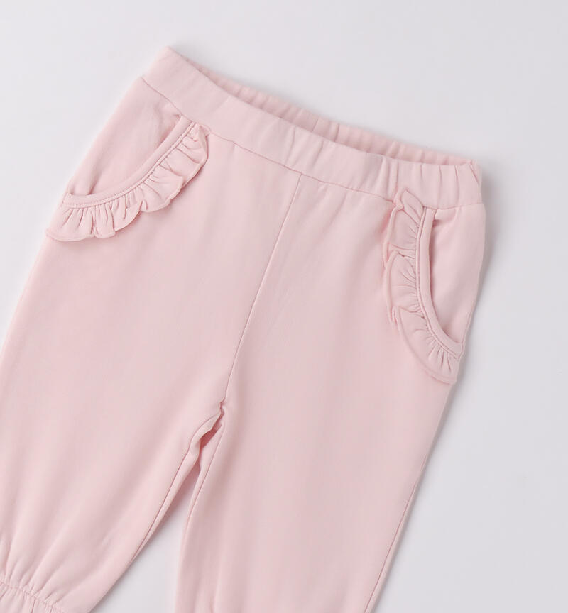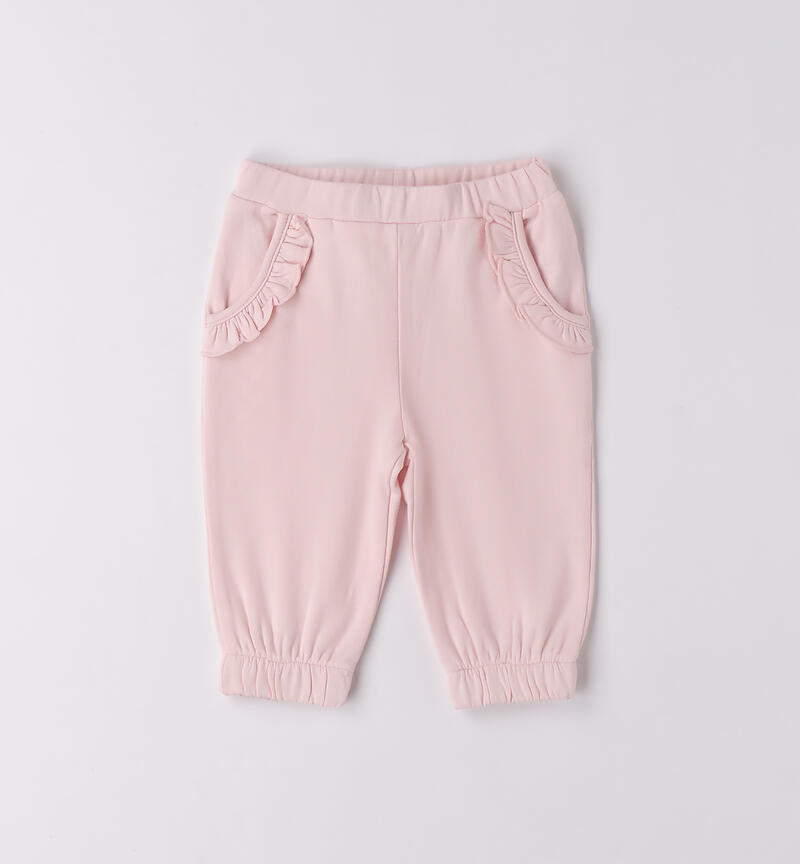Pantalone per bimba Minibanda 1-24 mesi in felpa invernale di cotone stretch, con felpatura interna. Elastico in vita e ruches sulle tasche. Elastico sul fondo gamba.
