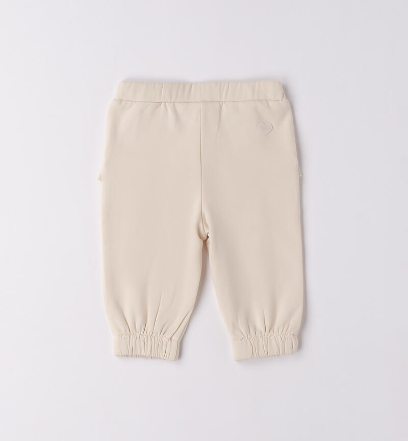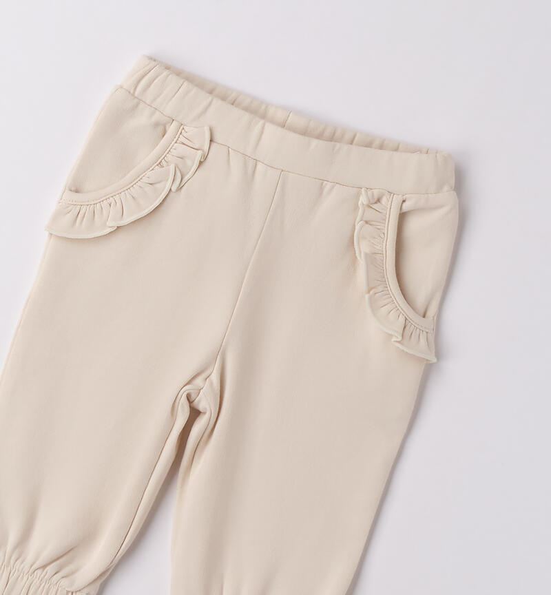 Pantalone per bimba Minibanda 1-24 mesi in felpa invernale di cotone stretch, con felpatura interna. Elastico in vita e ruches sulle tasche. Elastico sul fondo gamba.