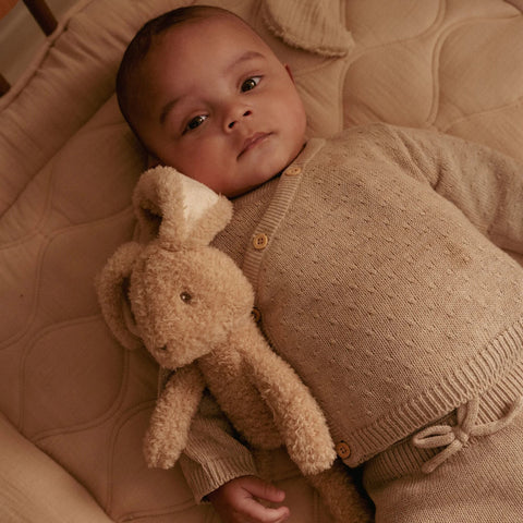 Un abbraccio morbido come una carezza. Baby Bunny è il compagno perfetto per il tuo piccolo, con le sue lunghe orecchie e il pelo soffice che invitano a coccole infinite. Abbastanza grande da poterci gattonare contro, eppure abbastanza leggero da poter essere portato ovunque. Che sia il momento di giocare, consolarlo o dormire, questo dolce coniglietto è sempre dove ne hai bisogno.