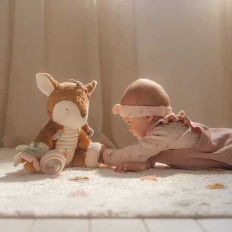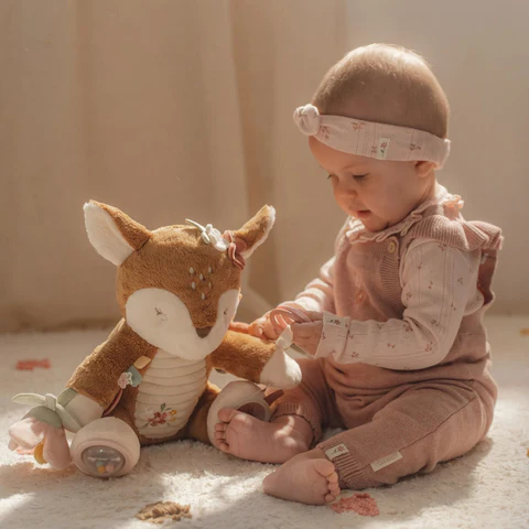 Coccole e giochi! Questo dolce cerbiatto promette molto più di semplici coccole. Scopri tutte le attività che nasconde. Il sonaglio, la farfalla che fruscia sulla spalla, le targhette e i fiori con cui giocherellare. Gli anelli sulla zampa e lo specchio sotto un piede: tanti dettagli per stimolare la curiosità del tuo piccolo. E dopo tutto quel gioco, il grazioso cerbiatto ispira i sogni più dolci sul giardino delle fate.