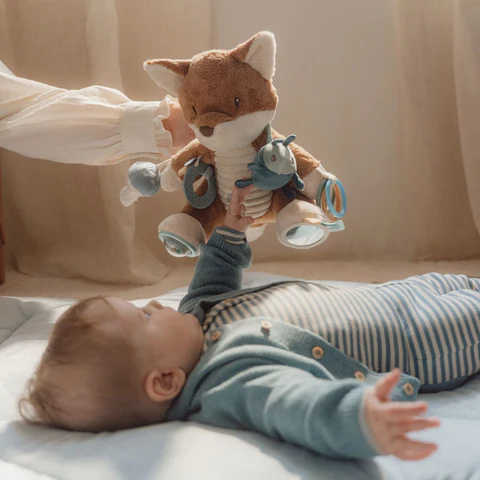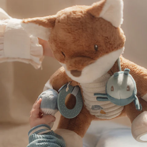 Coccole e giochi! Questa dolce volpina promette molto più di semplici coccole. Scopri tutte le attività che nasconde. Il tintinnio, lo scarafaggio frusciante sulla spalla, le targhette, una ghianda e un fungo con cui giocherellare. Gli anelli sulla zampa e lo specchio sotto un piede: tanti dettagli per stimolare la curiosità del tuo piccolo. E dopo tutto quel gioco, la simpatica volpina ispira i sogni più dolci sull’incantevole foresta dove giocano gli Amici della Foresta.
