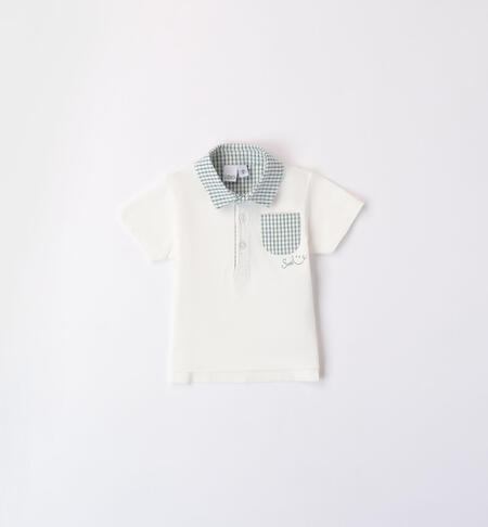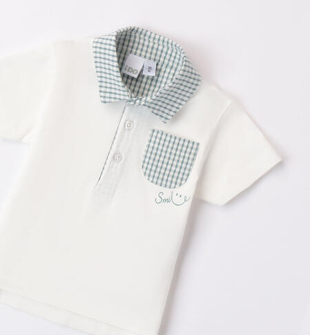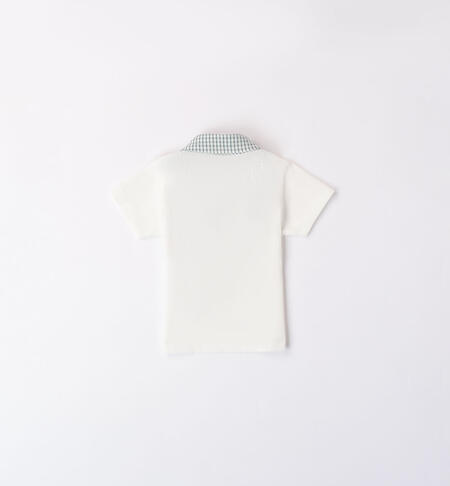 Polo a manica corta iDO per bimbo realizzata in jersey 100% cotone. Il modello presenta apertura davanti con bottoni e colletto e taschino in seersucker a quadri. Modello svasato con la parte dietro leggermente piรน lunga.