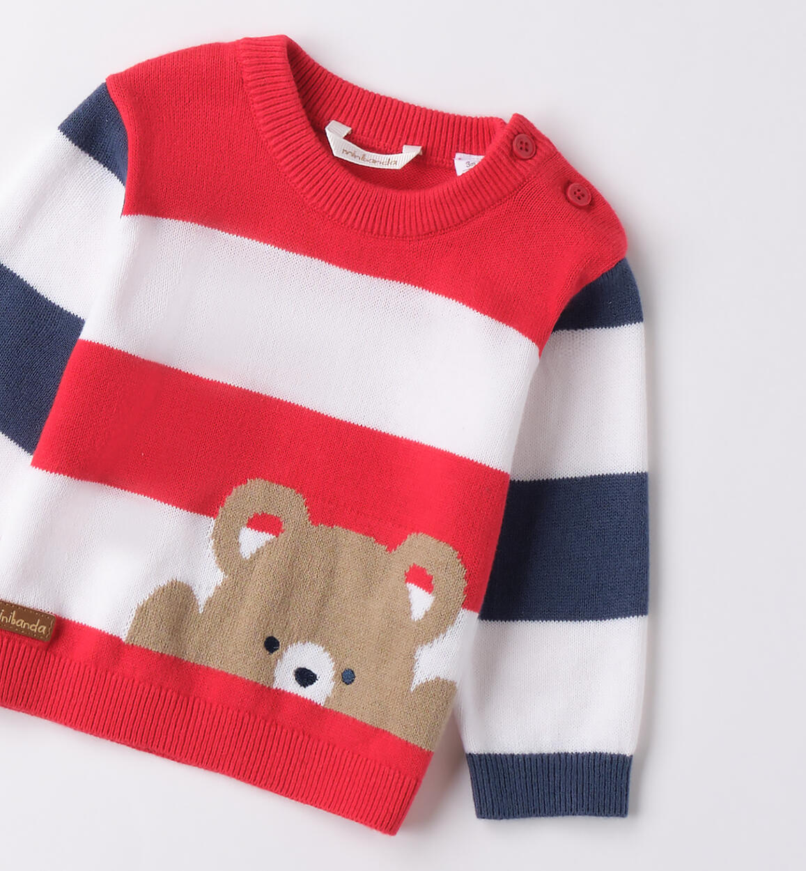Pullover neonato Minibanda realizzato in tricot 100% cotone. Il modello presenta apertura sulla spalla e fantasia a righe con ricamo intarsio orsetto.