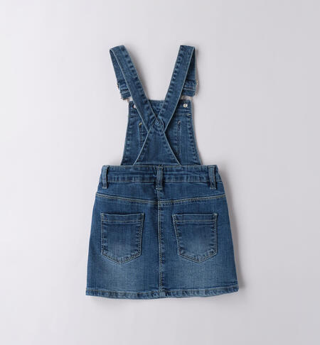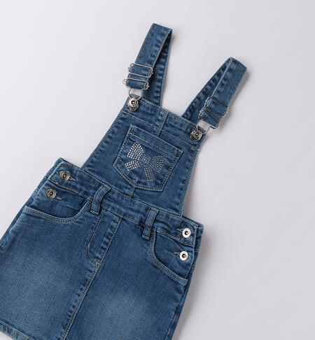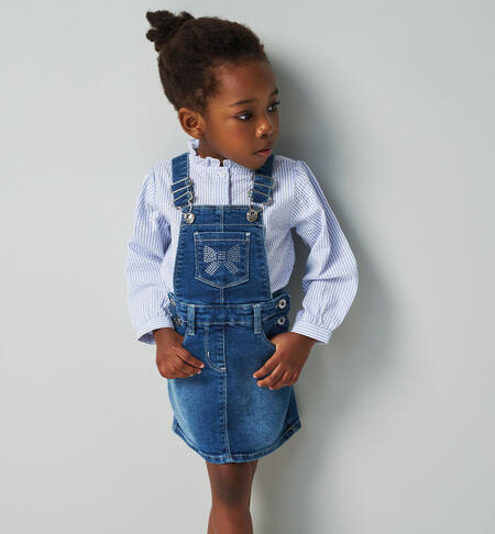 Salopette gonna bambina iDO da 9 mesi a 8 anni realizzata in denim stretch di cotone. Il modello ha taschino frontale con fiocco e strass, tasche laterali e bretelle regolabili.