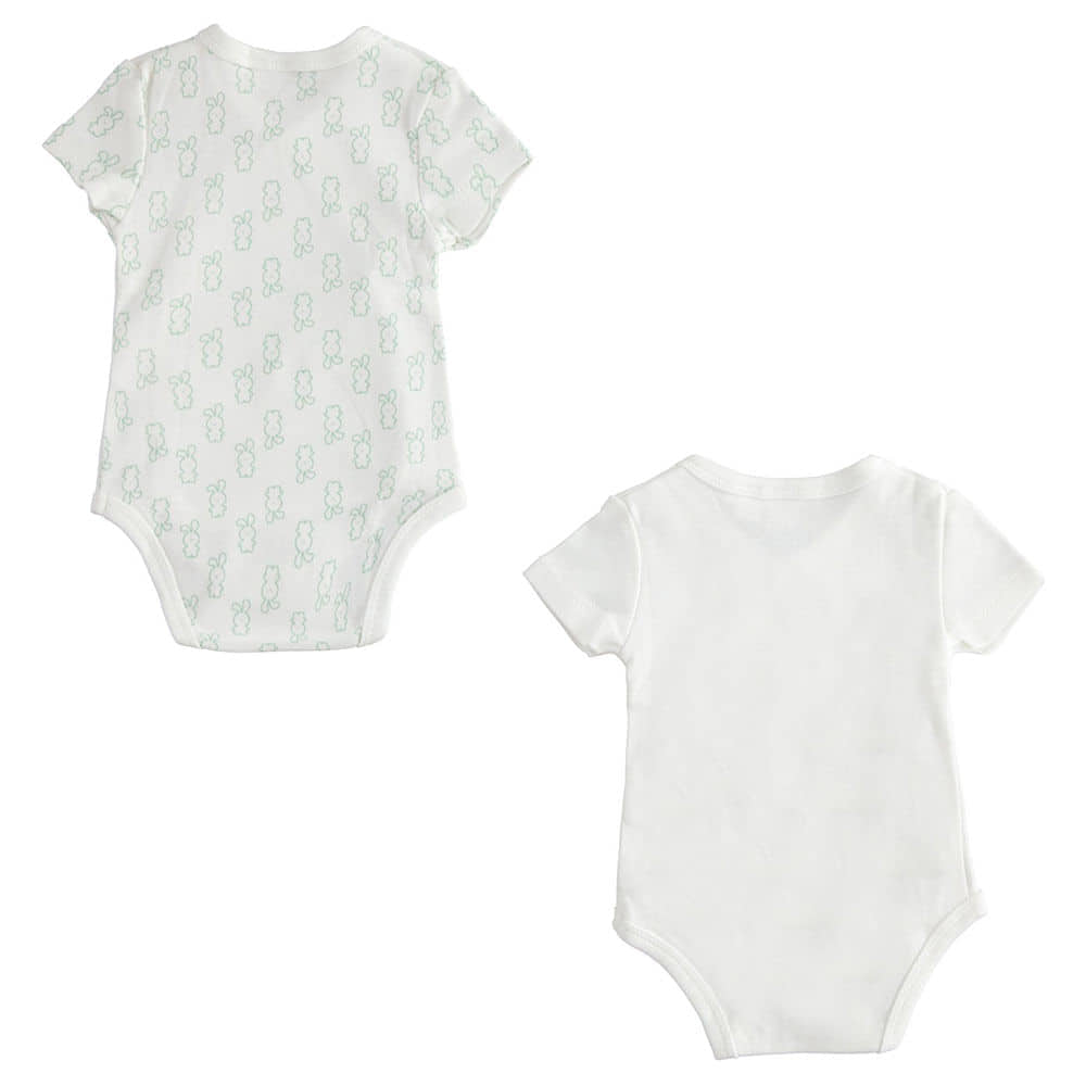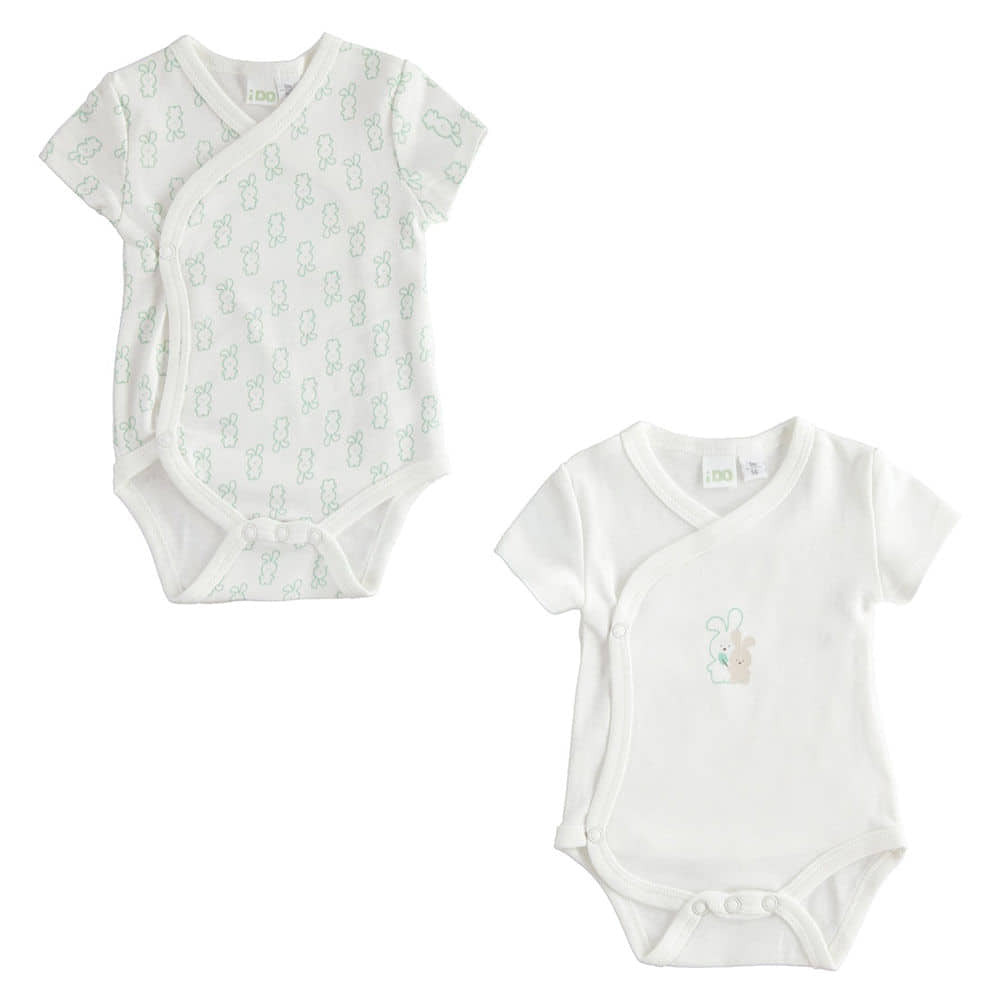 Set body iDO realizzato in interlock 100% cotone a manica corta. Il set è composto da due body con apertura davanti antipanico