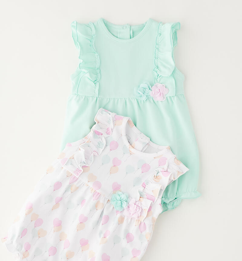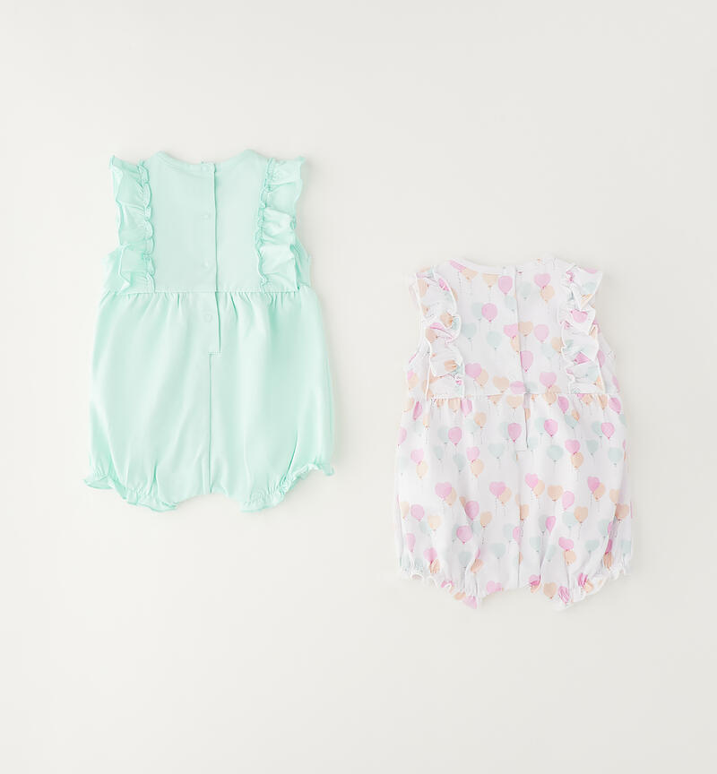 Set due pagliaccetti per neonata Minibanda realizzati in jersey stretch di cotone. Apertura dietro e nell’interno gamba con bottoni a pressione.