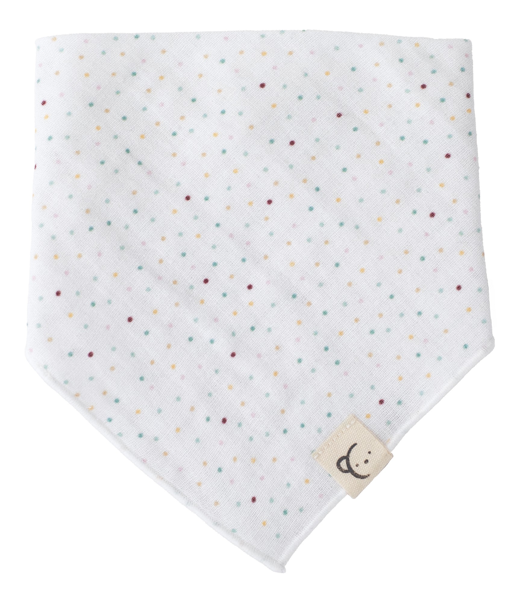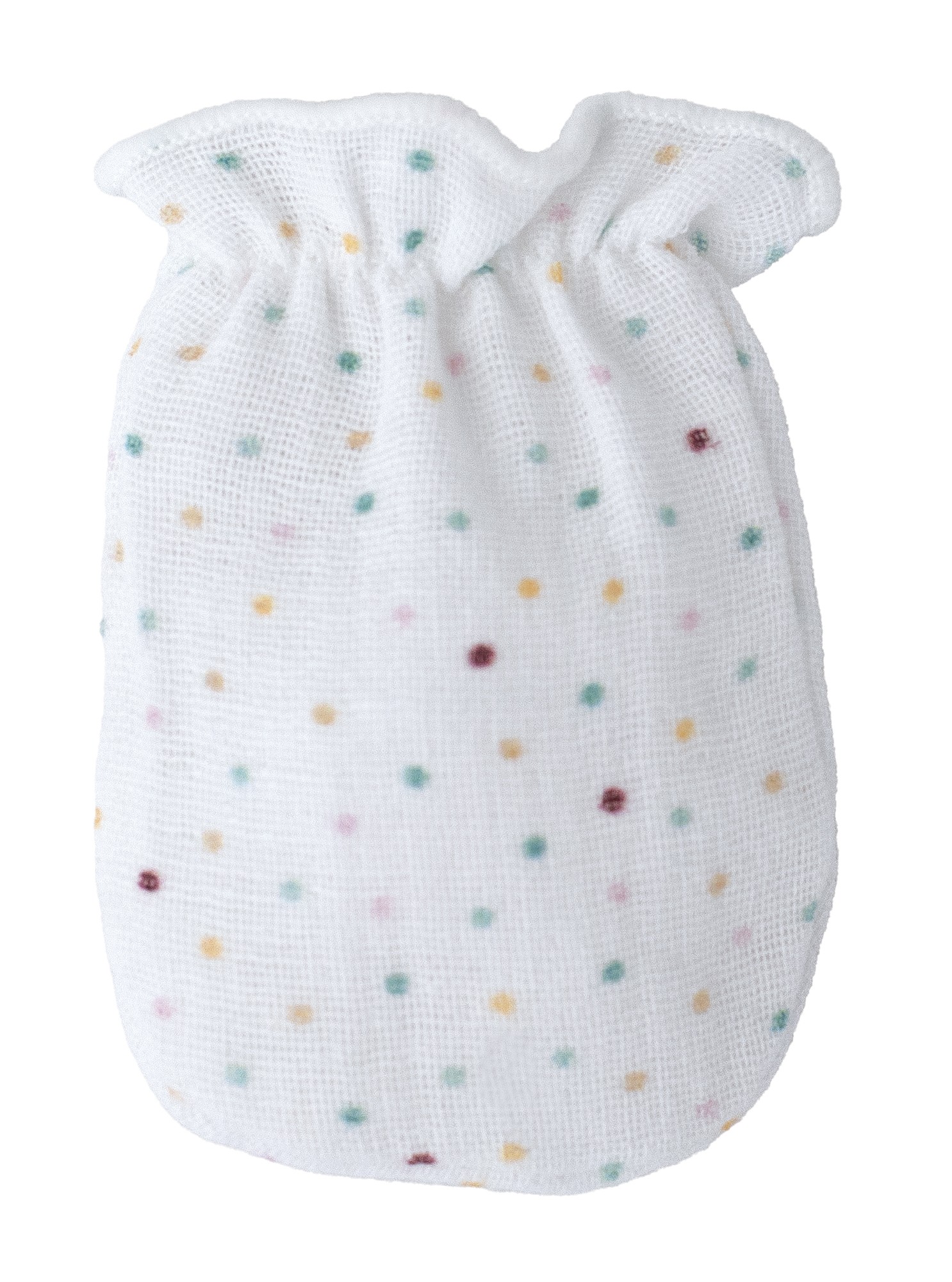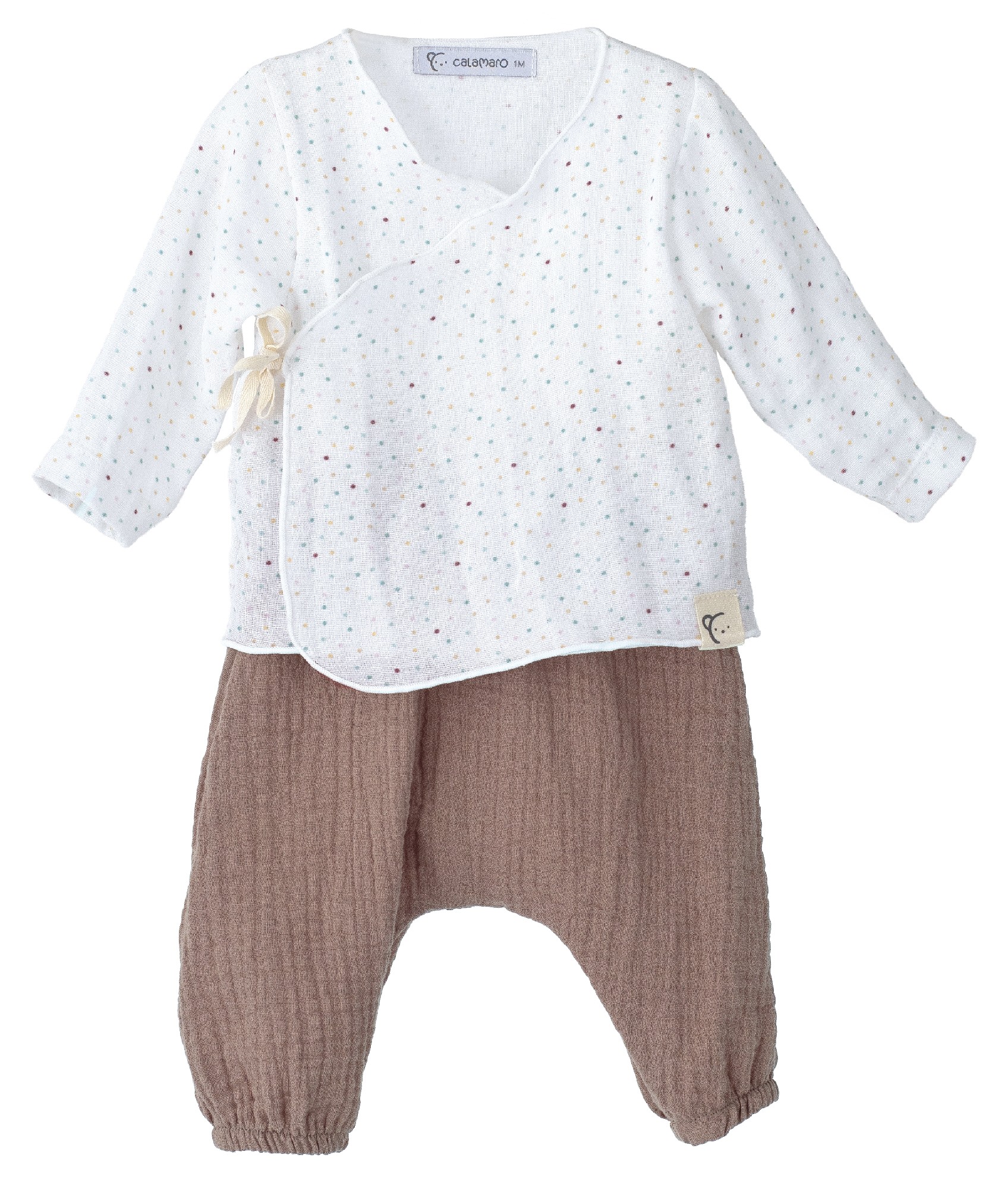 Set regalo in mussola di cotone, composto da camicetta, pantaloni, bavaglino e coppia di muffole.