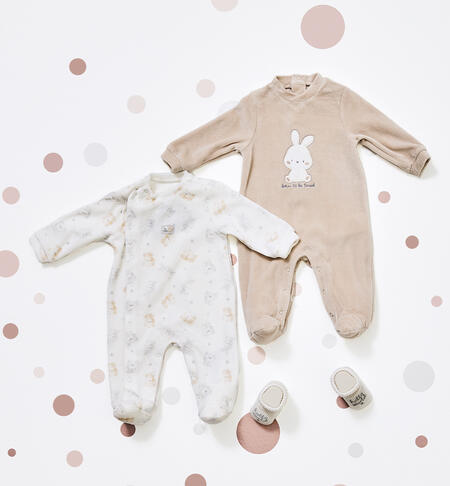 Tutine per neonati iDO 0-18 mesi in ciniglia. Un modello ha l’apertuta davanti e l’altro sulla schiena.