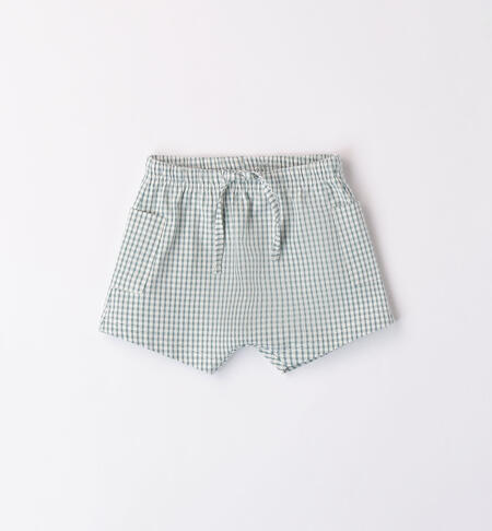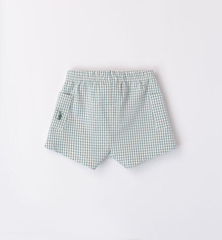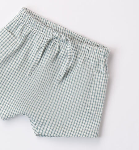 Shorts corti neonato realizzati in seersucker stretch di cotone. Il modello è dotato di vita elasticizzata con coulisse, tasche laterali e cavallo leggermente calato. I pantaloni presentano fantasia a quadri e coscia ampa. Lunghezza sopra al ginocchio.