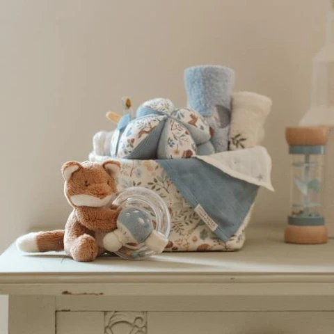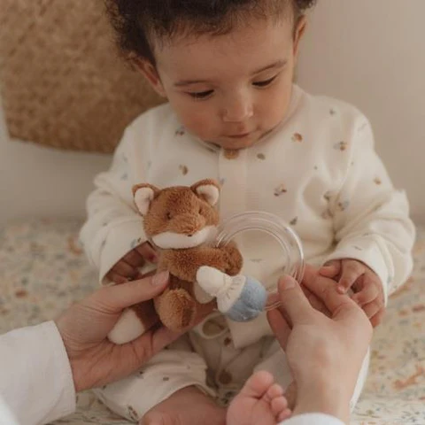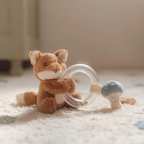 Afferra, gira e scuoti! La dolce volpe con la sua morbida pelliccia e la piccola coda ti invita a giocare e a far sentire questo sonaglio ad anello. Ha raccolto il piccolo fungo appositamente per te da coccolare. L’anello trasparente รจ riempito con 3 piccole perline che tintinnano quando il tuo bambino ci gioca. Questo grazioso giocattolo per bambini non solo stimola i sensi e la curiositร del tuo bambino, ma promuove anche la coordinazione occhio-mano.
