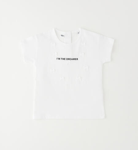 T-shirt per bambina iDO realizzata in jersey 100% cotone con stampa davanti e fiocchi in gros grain in applicazione.