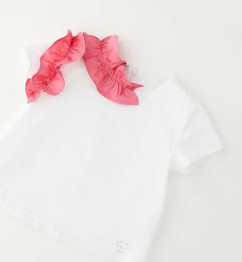 Camicia a manica corta per bambina Sarabanda realizzata in satin 100% cotone con ruches. Apertura dietro con zip invisibile. Logo di strass